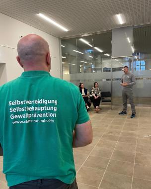 Aktiv ging es bei Marco Leik und Stephan Hohlfeld, vom Ju-Jutsu Verband Sachsen, zu. Die Teilnehmenden lernten hier in praktischen Übungen Gewaltprävention und Zivilcourage. Dabei ging es darum, wann man als Lehrkraft einschreiten sollte, wie man Gewalt unterbinden kann und was man im Vorfeld bereits durch Kommunikation verhindern kann.