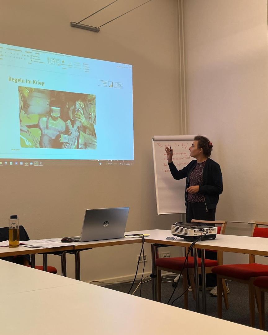 Nebenan erklärte Nora Manukjan, Referentin der Gedenkstätte Ehrenhain Zeithain, wie Nationalsozialisten damals Gewalt zu ihrem Vorteil einsetzten und wie heute das humanitäre Völkerrecht dabei helfen soll, derartige Gewalt einzuhegen.