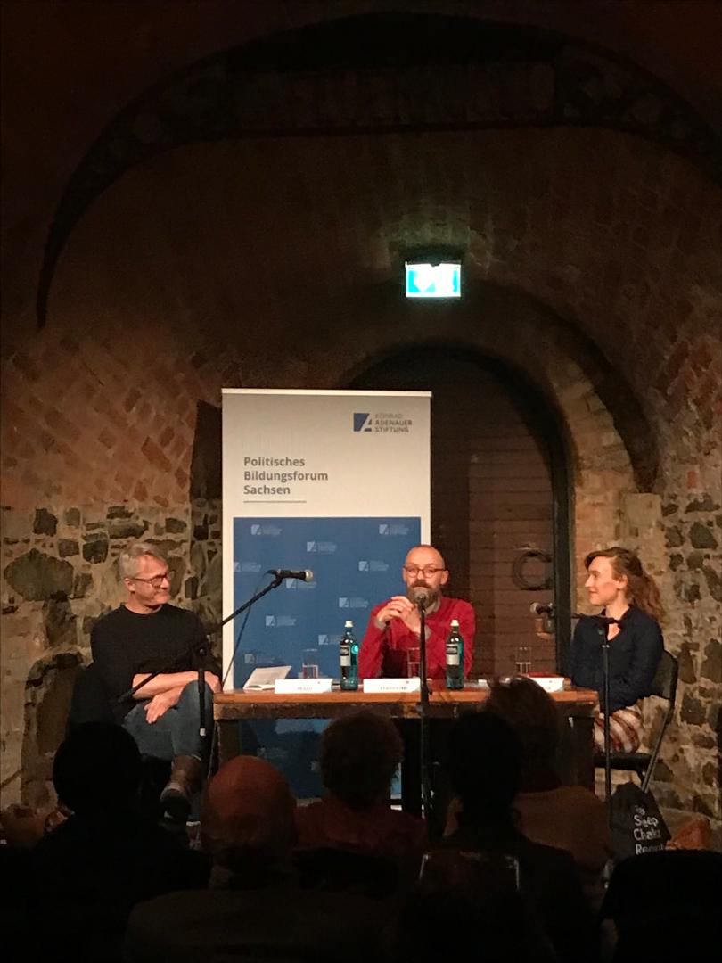 Die Einführungsveranstaltung fand am 15. Februar in der Moritz Bastei statt und hatte den Titel: „Zwischen Realität und Utopie-Kunst in Krisenzeiten“. Zu Gast waren Nora Bossong, sie ist freie Schriftstellerin und Essayistin, für ihre Gedichte, Romane und Essays wurde sie mehrfach ausgezeichnet, u.a. mit dem Joseph-Breitbach-Preis und dem Thomas-Mann-Preis und Prof. Dr. Marc Rölli, dieser ist Professor für Philosophie an der Hochschule für Grafik und Buchkunst in Leipzig. Die beiden diskutierten unter Moderation von Falk Hamann wie wird Kunst in Zeiten des Ukraine Krieges oder der Corona Krise wahrgenommen wird und welche Rolle sie zur Bewältigung von Krisen spielt. Außerdem wurde thematisiert, ob es in Zeiten von multiplen Krisen, zum Beispiel dem Klimawandel, der Ukraine Krieg oder die Corona Krise, einen spezifischen Beitrag gibt den Kunst leisten könne, um mit diesen Krisen als Gesellschaft umgehen zu können. Da die Referentin und der Referent beide aus verschiedenen Kunstformen kamen, konnten sie sich angeregt austauschen und ergänzen.
