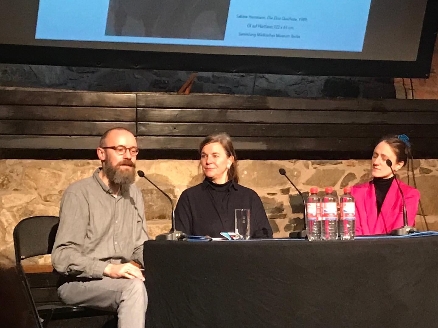 Die letzte Veranstaltung unter dem Titel „Abbild der Veränderung-Transformation künstlerisch greifbar machen“ fand am 15. März mit Sabine Herrmann, welche freischaffende Künstlerin aus Berlin ist und mit Lea Petermann, welche freischaffende Künstlerin in Leipzig ist und sich in ihren Arbeiten mit den Auswirkungen von Transformation und Trauma auf das Leben und den Körper beschäftigt, statt. Mit dem sich mehr und mehr zuspitzenden Klimawandel und damit einem neuen Bewusstsein des Verhältnisses von Mensch und Natur tritt aktuell ein neuer Bereich der Veränderung in den Fokus der bildenden Kunst. Dabei stellt sich vor allem die Frage, wie diese verschiedenen Typen von Transformation gerade in der bildenden Kunst dargestellt und verarbeitet werden können. Anhand konkreter Werke der beiden Künstlerinnen, die jeweils verschiedenen Generationen angehören, gingen wir dieser Frage nach. Dabei sprachen sie nicht nur über ihre eigene Kunst, welche die Malerei und Installationen umfasste, sondern sie gingen auch auf ihre eigenen Intensionen zu ihren Werken ein. In den Werken der beiden Künstlerinnen wurde vor allem die Erinnerungskultur, Verarbeitung von Traumata und die Rolle der Frau in der Gesellschaft thematisiert. Durch ihre Beschreibungen, wie die Werke zum Teil entstanden, konnte den Teilnehmerinnen und Teilnehmern gezeigt werden wie Transformation von Kunst künstlerisch greifbar gemacht werden. Falk Hamann, Moderator der Veranstaltung, fragte wie ein Kunstwerk gesellschaftlich wirken könne. Es sei keine Lösung, sondern ein Prozess ein Kunstwerk zu schaffen und eine Auseinandersetzung mit dem Thema oder dem Titel, welcher meistens in vielschichtiger Art und Weise bearbeitet wurde. Das sich Hineinbegeben, verlangt einen Prozess, um das Schöne zu erkennen, antworteten die beiden Künstlerinnen. Nach den Inputvorträgen wurde wieder angeregt mit dem Publikum diskutiert und Fragen beantwortet.