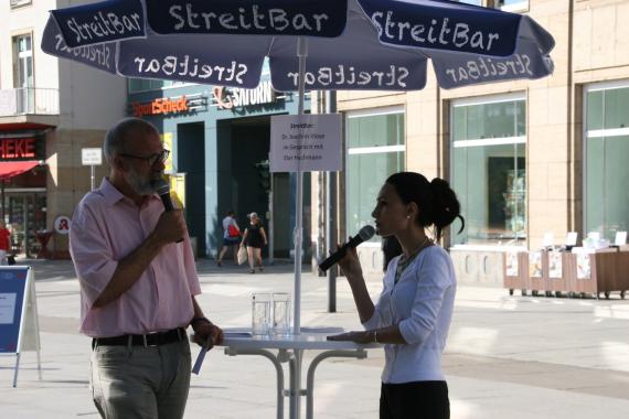 Im Anschluss an Frau Mertsching kam Martin Modschiedler, Mitglied der Sächsischen Landesfraktion der CDU im Landtag an die „StreitBar“. Herr Modschiedler besprach vor allem die Themen direkte Demokratie, mehr Bürgerbeteiligung und mehr Transparenz bei politischen Entscheidungsprozessen. Auch im Anschluss an dieses Gespräch hatten die Zuschauer großen Redebedarf und stellten Herrn Modschiedler verschiedene Fragen zu direkter Demokratie und Transparenz in politischen Prozessen. Als letzte Gesprächspartnerin wurde Eter Hachmann vom Ausländerrat Dresden e.V. eingeladen. Mit Frau Hachmann wurden Fragen zur Integrationspolitik und zur Angst vor fremden Kulturen behandelt.