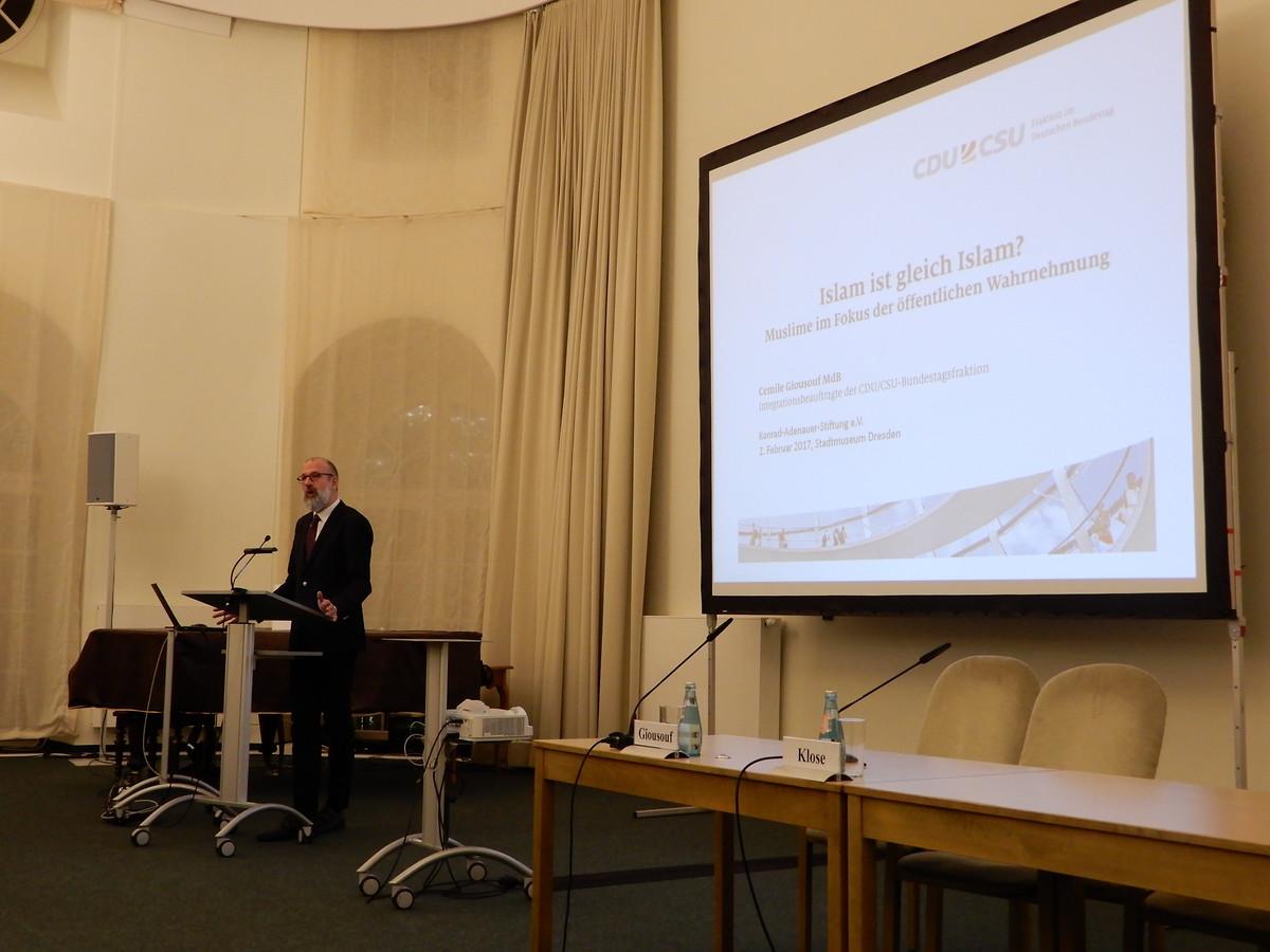Der Islam spaltet die deutsche Gesellschaft. Auf der einen Seite stehen diejenigen, die eine „Islamisierung“ Deutschlands fürchten und daher gegen den Islam protestieren. Diese fühlen sich durch die Medienberichte, in denen der Islam meist in negativem Kontext oder in seiner radikalen politischen Form, dem Islamismus auftaucht, bestätigt. Aber warum ist die öffentliche Wahrnehmung des Islam so schlecht? Über dieses Thema sprachen wir am 02.02.2017 mit Cemile Giousouf MdB im Dresdner Stadtmuseum. Anfangs sprach Dr. Joachim Klose, Landesbeauftragter der Konrad-Adenauer-Stiftung für den Freistaat Sachsen einige einleitende Worte und übergab dann an Frau Giousouf. Diese begann mit der Erklärung warum sie als Muslim in einer christlichen Partei sei. So hätten die monotheistischen Religionen viel gemeinsam. Für sie sei ihre Religion sehr wichtig, weswegen sie sich in einer Partei engagieren wolle, die der Religion eine größere Bedeutung beimesse.
