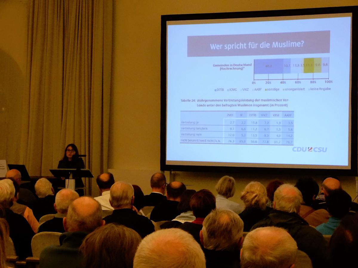 Anschließend ging Frau Giousouf auf das Thema der „muslimischen Verbände“ ein. So haben die Muslime kein religiöses Oberhaupt wie den beispielsweise den Papst im Christentum. Daher sind die Muslime weltweit in unterschiedlichen Organisationen organisiert. Die größte Organisation ist die Türkisch-Islamische Union der Anstalt für Religion e.V. (DITIB) mit 900 muslimischen Gemeinden. Hierbei sei die Kontrolle der türkischen Regierung über DITIB problematisch. Die meisten Verbände haben sich zum sogenannten Koordinationsrat der Muslime in Deutschland zusammengeschlossen. Als weiteren Punkt sprach Frau Giousouf die Demokratienähe der Muslime an. So halten 90% der hochreligiösen Muslime die Demokratie für eine gute Staatsform und 93% sagen man solle allen Religionen gegenüber offen sein. Gleichzeitig halten jedoch auch 13% eine interkonfessionelle Ehe für eine Schande.