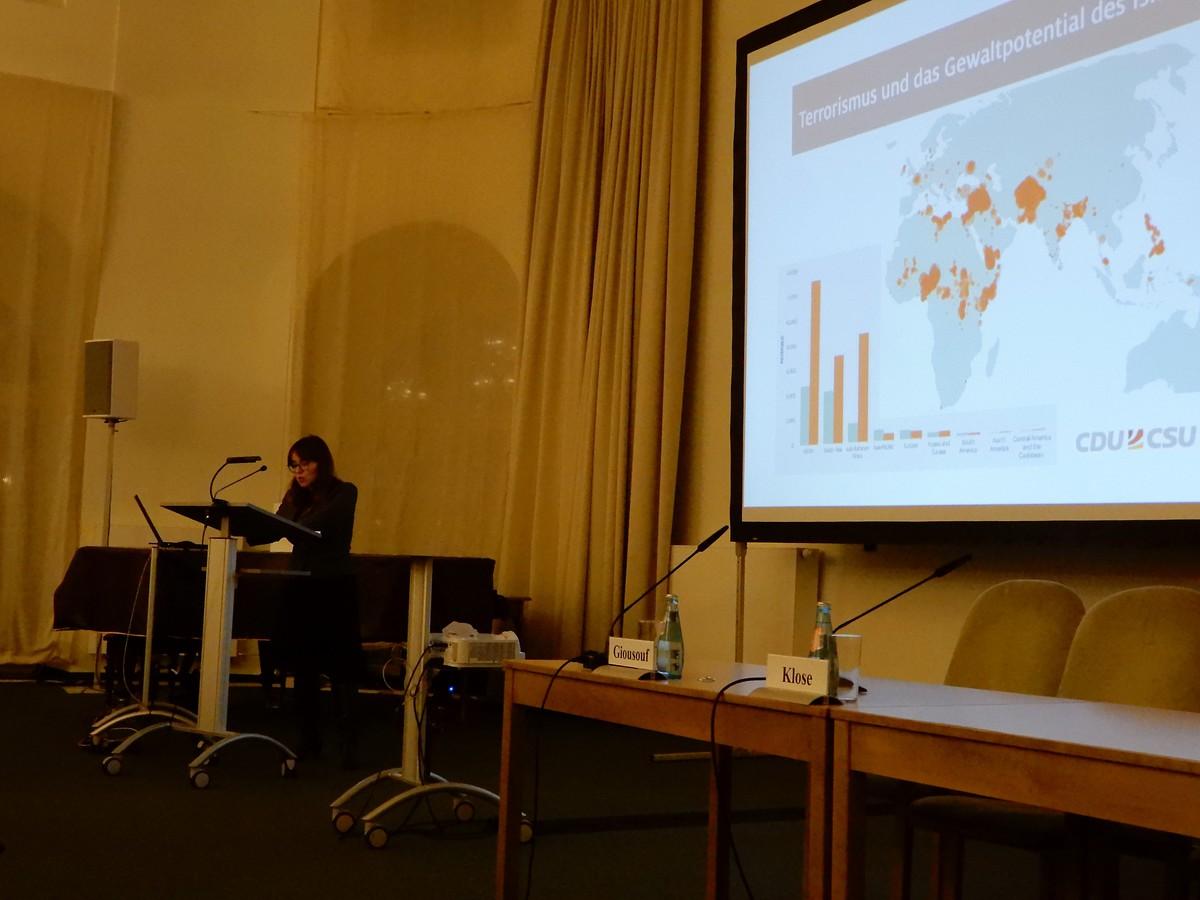 Auch das Thema "Terror und Flüchtlinge" wurde von Frau Giousouf angesprochen. So seien seit der Flüchtlingskrise, die nicht vorherzuahnen gewesen sei und auf die man daher vollkommen unvorbereitet war, 37% der Asylantragssteller aus Syrien, Afghanistan und dem Irak gekommen. Vor der Flüchtlingskrise stammten die Immigranten überwiegend aus christlich geprägten europäischen Ländern wie Griechenland, Spanien oder Polen. Man solle beachten, dass immer noch die Staaten der MENA-Region am häufigsten vom Terrorismus getroffen seien und demnach hauptsächlich Muslime Opfer der Anschläge seien. Dabei seien vier Gruppen für die meisten Anschläge weltweit verantwortlich. Die Muslime wollen jedoch den brutalen Terror von ihrer Religion getrennt sehen. Hierbei verlaufe eine Grenze nicht zwischen Muslimen und Nicht–Muslimen, sondern zwischen Anhängern des Rechtsstaates und ihren Gegnern.
