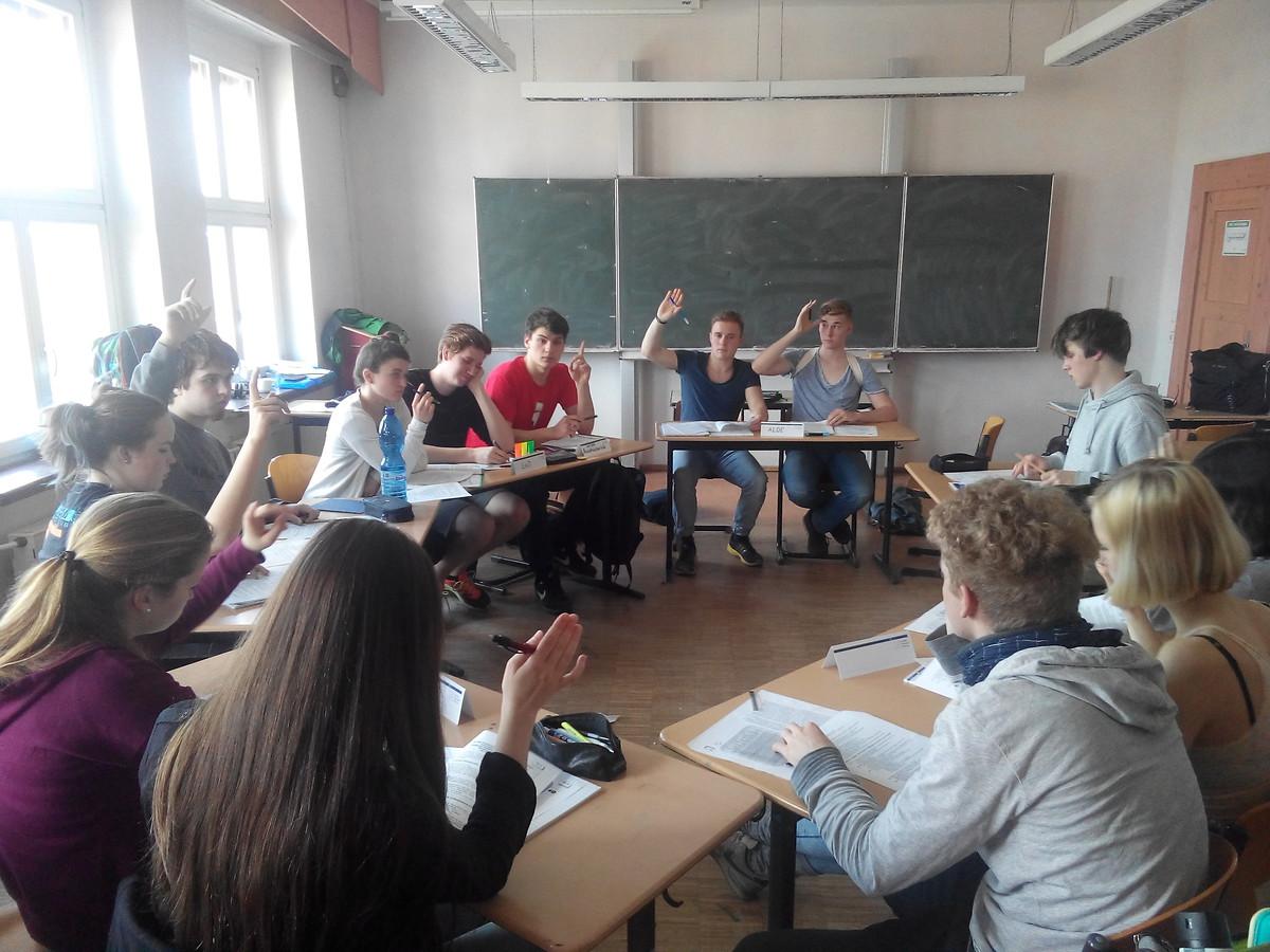 Mittendrin statt nur dabei – das konnten Schülerinnen und Schüler der Oberstufe der Freien Waldorfschule Leipzig am 6. April 2016 im Rahmen eines Planspiels zur Migrationspolitik der Europäischen Union erleben. Referent Steffen Hetzschold, wissenschaftlicher pädagogischer Mitarbeiter der Konrad-Adenauer-Stiftung e.V. in Magdeburg, eröffnete die Veranstaltung mit einem Einblick in die Arbeit der Stiftung und informierte die Teilnehmenden über die Ursachen und Hintergründe globaler Flüchtlingsströme sowie über die europäische Migrationspolitik. Im Gespräch tauschten sich die Schülerinnen und Schüler mit dem Referenten über ihre eigenen Erlebnisse und Erfahrungen mit Flüchtlingen aus und stellten viele Fragen zur Flüchtlingspolitik in Deutschland und Europa. Wie die EU funktioniert, welche Organe es gibt und wie die Akteure Entscheidungen treffen, wurde im Folgenden mithilfe einer Präsentation veranschaulicht.