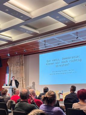 In der anschließenden Diskussionsrunde stellten die Teilnehmenden spannende Fragen, die die Komplexität des Themas widerspiegelten: Wie kann man sich trauen, in einer polarisierten Gesellschaft zu diskutieren? Was bedeutet es, richtig zu streiten? Sollte man sich mit extrem rechten Positionen auseinandersetzen, oder ist es besser, diese zu meiden? Und müssen nicht nur die Älteren, sondern auch die Jüngeren wieder lernen zu streiten, um damit die Grundlage für eine lebendige Demokratie zu bewahren?