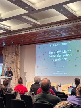Der zweite Referent der Veranstaltung, Dr. Mathias Jaudas von der Universität der Bundeswehr München mit Forschungsschwerpunkt Sozial- und Konfliktpsychologie, vermittelte den Teilnehmenden ein Verständnis darüber, wie Konflikte entstehen. Er erläuterte, dass Konflikte vor allem dann entstehen, wenn normative Unvereinbarkeiten auftreten – also, wenn tiefgreifende Werte und Überzeugungen miteinander kollidieren. Dies sei etwa der Fall, wenn bei einem Wettkampf zu früh gestartet wird oder wenn grundlegende Prinzipien in Frage gestellt werden, die für eine Gruppe oder Gesellschaft als unverhandelbar gelten.