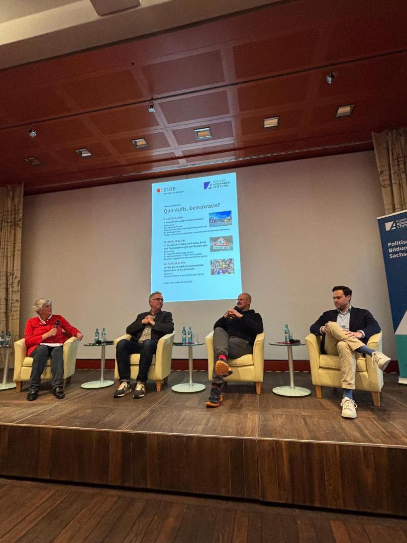 Im Anschluss betrachteten Dr. Herrmann Diebel-Fischer von der TU Dresden sowie Benjamin Läpple die Wechselwirkungen zwischen Demokratie und technologischer Entwicklung. Dr. Diebel-Fischer beleuchtete insbesondere das Potenzial Künstlicher Intelligenz im Kontext des demographischen Wandels und des Fachkräftemangels. KI könne etwa als Prognoseinstrument, als automatisiertes Entscheidungssystem (beispielsweise bei Passkontrollen an Flughäfen) oder als Assistenzsystem in der Pflege eingesetzt werden. Dabei warf er die grundlegende Frage auf, wie weit unser Vertrauen in technische Systeme reichen kann – und ob künftig der Mensch die Technik steuert oder umgekehrt die Technik den Menschen. Benjamin Läpple lenkte den Blick auf die Schattenseiten der digitalen Welt und ihre potenziellen Gefahren für demokratische Prozesse. Er warnte vor einer zunehmenden Reizüberflutung durch digitale Inhalte, die zu einem Abbau von Empathie führen könne. Zudem begünstigten extreme und emotionalisierende Inhalte in sozialen Netzwerken die gesellschaftliche Radikalisierung. Insgesamt, so Läpple, verändere der digitale Raum nicht nur unsere Wahrnehmung, sondern auch unser Fühlen und Handeln – mit spürbaren Auswirkungen auf den demokratischen Diskurs.