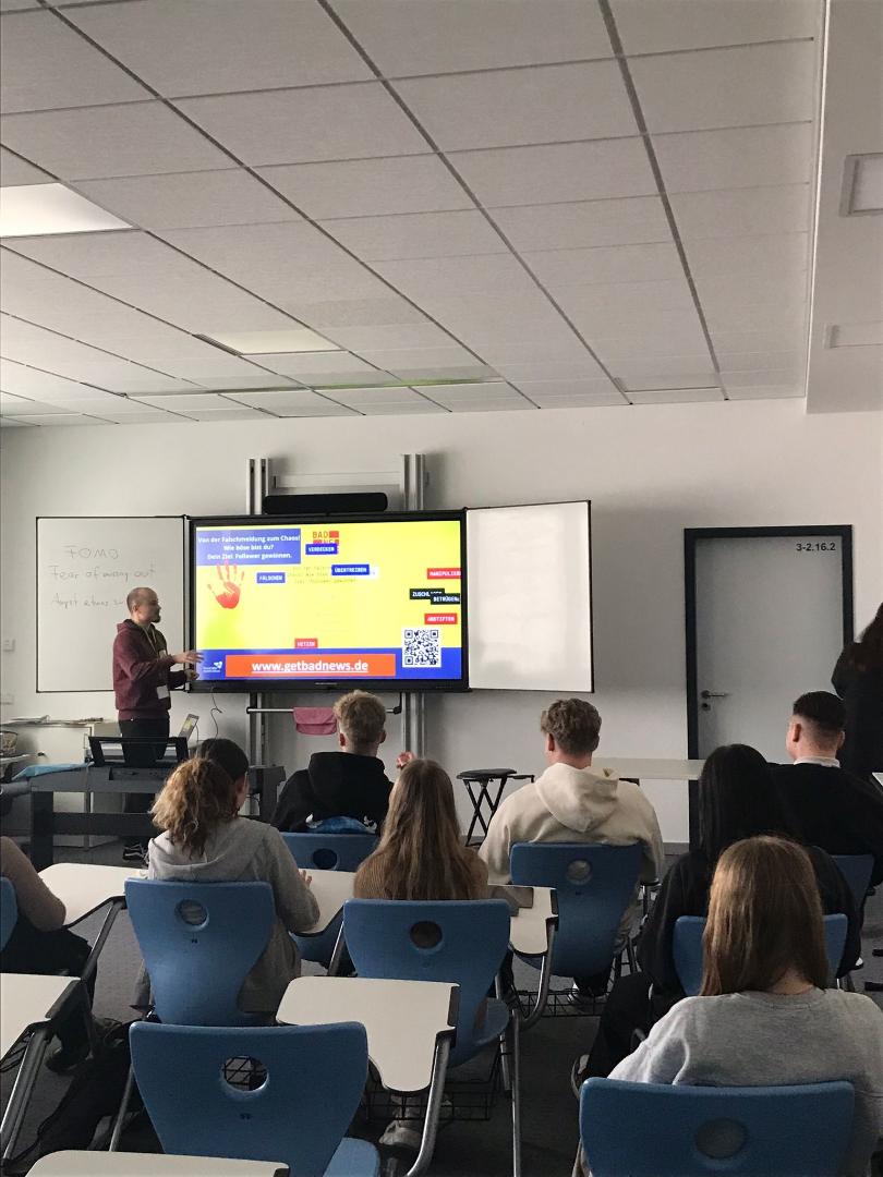 Mit den Workshops "Medienkompetenz- Strukturen erkennen und Mechanismen verstehen" und "Fake News und Medienbildung" erhielten die Jugendlichen einen umfassenden Überblick zum Umgang mit dem Internet. Johannes Pursche von Social Web macht Schule blieb auf gleicher Ebene der Jugendlichen und verknüpfte geschickt den Workshop mit einer PowerPoint Präsentation und interaktiven Spielen an der elektrischen Tafel. Mit einem echten Post, welcher Falschinformationen enthielt konnten die Schülerinnen und Schüler lernen, wie und woran sie Falschinformationen erkennen können. Anschließend erfuhren die Schülerinnen und Schüler wie sie sich verhalten sollten, wenn Fake News in ihrem näheren Umfeld versendet würden.