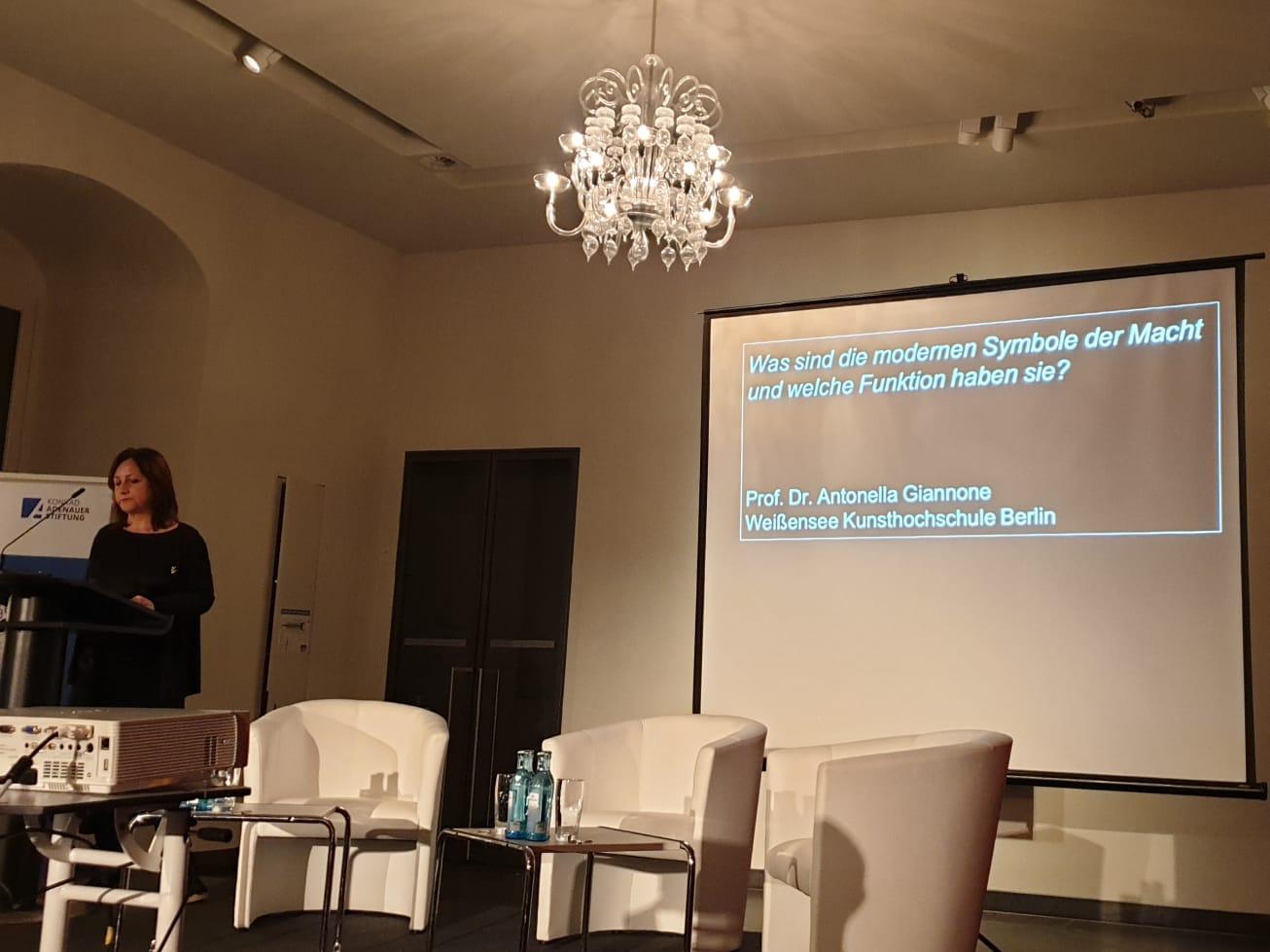 Prof. Antonella Gianonne, Professorin für Modetheorie, -geschichte und Bekleidungssoziologie an der Kunsthochschule Weißensee in Berlin, sprach darüber, wie Macht heute inszeniert wird. Macht werde heutzutage meist individuell verkörpert, und durch den Körper der Mächtigen zelebriert. Von normalen Menschen sind die Mächtigen augenscheinlich kaum zu unterscheiden, sodass Nähe konstruiert wird. Luxus ist undienlich für demokratische Legitimation, denn die Herrschenden sind Vertreter des Volkes mit denen sich die Bürger vor allem identifizieren wollen. Außerdem verschieben neue mediale Umstände die Grenzen zwischen der öffentlichen Bühne und dem privaten Backstagebereich. Hat J. F. Kennedy bei seiner Amtseinführung noch einen Zylinder getragen, so gab sich Barack Obama als Präsident oft locker im Hemd. Durch den bewussten Verzicht auf Exklusivität werden Hierarchien ausgeblendet. Die Mächtigen wirken zunächst sympathischer, doch laut Prof. Giannone sei es wichtig, sich nicht von der Kleidung blenden zu lassen, sondern die Inszenierung der Machthaber stetig zu hinterfragen.