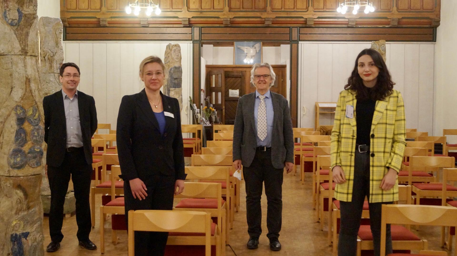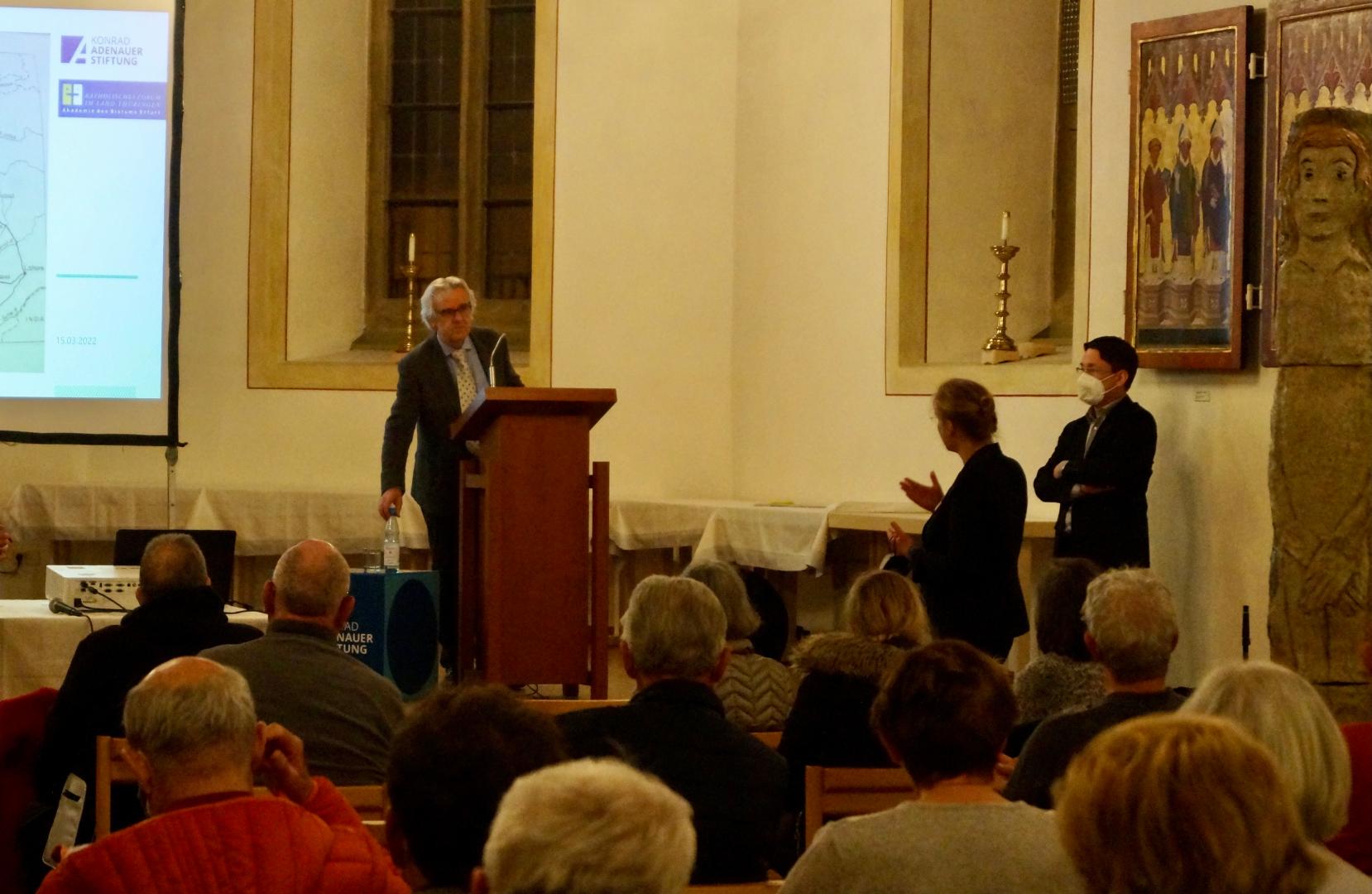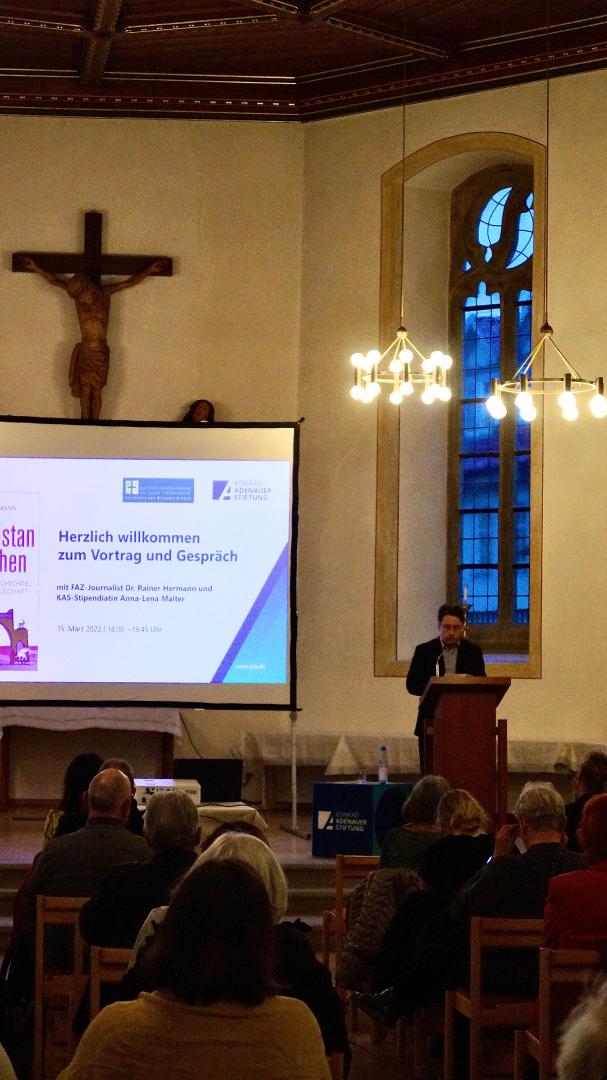 Am Dienstagabend strömten viele interessierte Bürgerinnen und Bürger trotz des regnerischen Wetters in die Brunnenkirche in der Nähe des Erfurter Domplatzes. Die erste Präsenzveranstaltung des Bildungsforums in diesem Jahr traf auf großen Anklang und allen Beteiligten war anzumerken, wie sehr man sich darauf freute. Um 18 Uhr hieß Niklas Wagner, Akademieleiter des katholischen Forums, das Publikum sowie die Referenten herzlich willkommen und bedankte sich im Vorfeld für das Interesse an diesem Thema, obwohl es momentan vom Krieg in der Ukraine überschattet werde. Es folgte eine kurze biografische Vorstellung Rainer Hermanns, der Volkswirtschaftslehre und Islamwissenschaften in Freiburg, Rennes, Basel und Damaskus studiert hat und als Korrespondent u. a. aus Istanbul, Kuweit und Abu Dhabi berichtete. Durch die Veranstaltung führte Anna-Lena Malter, Stipendiatin der Journalistischen Nachwuchsförderung der Adenauerstiftung, die neben ihrem Studium bereits als freie Journalistin tätig ist.