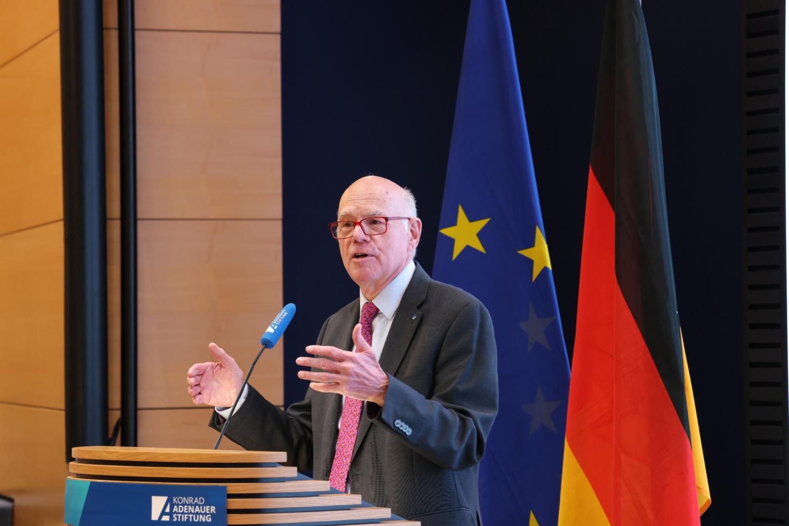 Zum Ende des Abends ergriff Hans-Gert Pöttering selbst das Wort. Mit Dankbarkeit für die Weggefährten seiner langen politischen Laufbahn richtete er den Blick zugleich auf die kommenden Herausforderungen. Seine abschließenden Worte verbanden persönliche Demut mit einem klaren Appell für die Zukunft Europas: