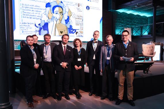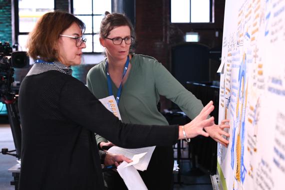 In einer Abschlussrunde stellten die Vortragenden gemeinsam mit Teilnehmenden aus dem Publikum ihre Ergebnisse und Erkenntnisse aus den einzelnen Podiumsgesprächen vor. Während des ganzen Tages übersetzten die beiden Zeichnerinnen Birgit Jansen und Kirsten Reinhold die vorgetragenen Ergebnisse in Bilder und Symbole. Das fertige, illustrierte Protokoll konnte am Ende der Veranstaltung von allen bestaunt werden.