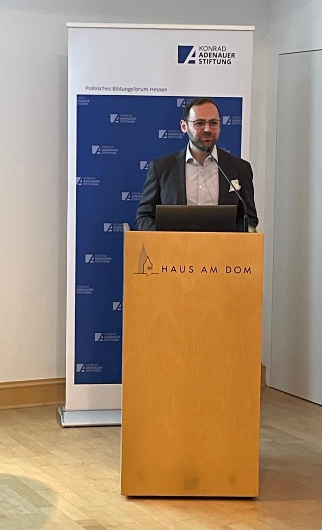 Nach Begrüßung und inhaltlicher Einführung durch Felix Kraft berichtete Dr. Pavel Usvatov, Leiter des Rechtsstaatsprogramms Südosteuropa der Konrad-Adenauer-Stiftung mit Sitz in Bukarest/Rumänien, von seiner Arbeit, seinen Eindrücken vor Ort und über die Gesamtsituation in der Region. Die Veranstaltung widmete sich der Rolle der Rechtsstaatlichkeit in den EU-Beitrittsländern für die Sicherheit in der EU. Dr. Usvatov erläuterte, wie der Rechtsstaat die innere Stabilität fördere, indem er unter anderem Vertrauen in die Institutionen schaffe und Korruption bekämpfe. Doch auch für die äußere Sicherheit sei die Rechtsstaatlichkeit von zentraler Bedeutung: Eine stabile Region benötigte unabhängige Institutionen, die externen Manipulationen widerstehen und zwischenstaatliches Vertrauen aufbauen könnten. Am Fallbeispiel Rumänien wurden im Anschluss die damit verbundenen Herausforderungen diskutiert.