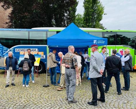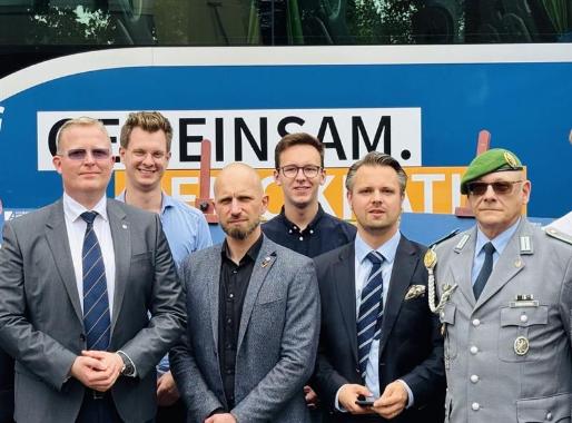 Reger Austausch herrschte am Demokratiebus der KAS, noch bevor der zweite Teil des Tages Fahrt aufnahm: In einer packenden Schilderung nahm Wolf Gregis das Publikum mit an jenen 2. April 2010, an dem deutsche Soldaten bei Kunduz in einen Hinterhalt gerieten. Mehr als acht Stunden kämpften sie im Karfreitagsgefecht gegen eine Überzahl von Taliban, bei dem drei Kameraden fielen und fünf verwundet wurden. Kurz darauf sprach die Politik erstmals vom „Krieg in Afghanistan“.