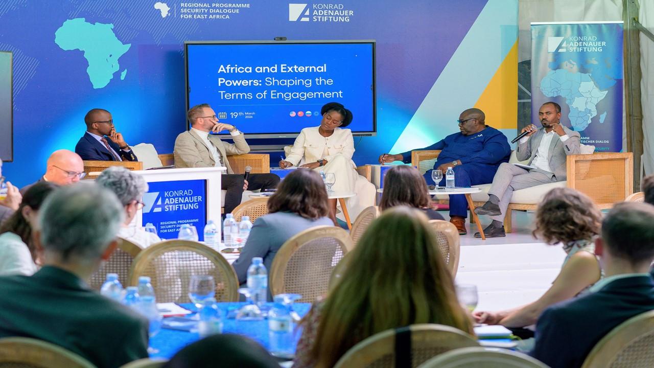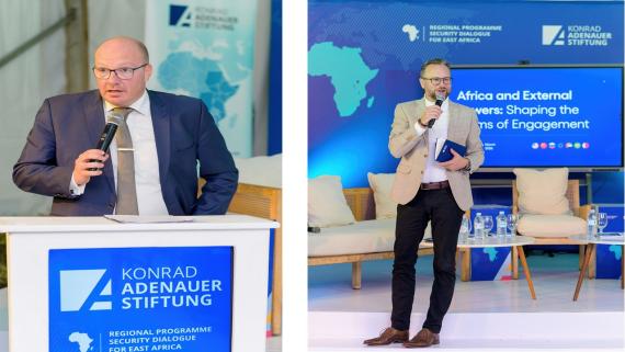 Die Veranstaltung begann mit einer Begrüßungsrede von Nils Wörmer, Leiter des KAS RP SIPODI Ostafrika, der den zahlreichen Teilnehmern für ihre Anwesenheit dankte. Die Podiumsdiskussion wurde von Mathias Kamp, Landesvertreter des KAS-Auslandsbüros Kenia, moderiert, der in seiner Eröffnungsrede die geopolitische Bedeutung des derzeitigen Engagements externer Akteure in ganz Afrika hervorhob. Er beleuchtete, wie afrikanische Regierungen und Institutionen auf diese Entwicklungen reagieren, und wies auf die zunehmenden Debatten hin, die sich um den souveränen Zugang afrikanischer Staaten zu natürlichen Ressourcen, Entwicklungshilfe, Frieden und Sicherheit sowie die sich wandelnde Rolle Afrikas in der Weltpolitik drehen.