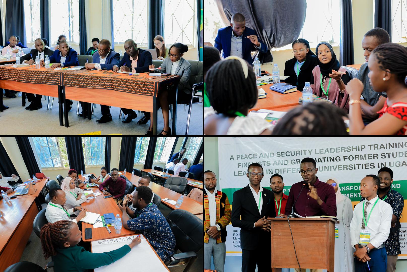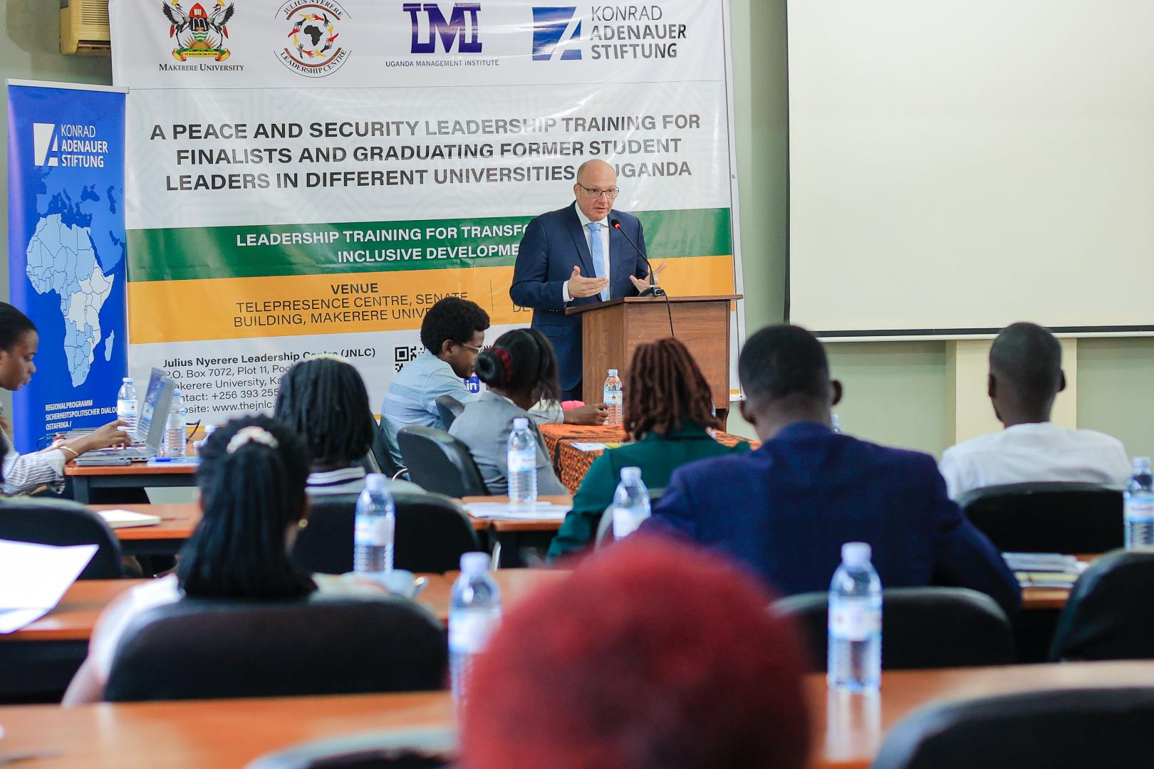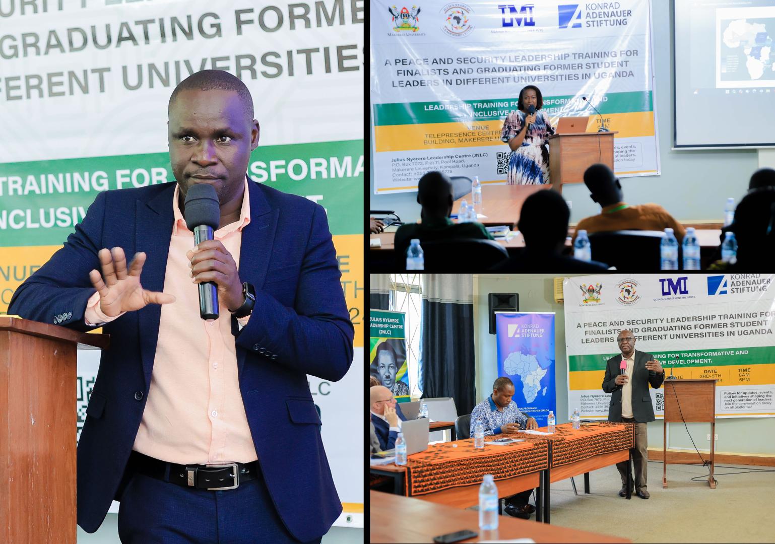 Prof. Phillip Kasaija von der Fakultät für Politikwissenschaften an der Makerere Universität sprach in dem ersten Vortrag des Tages über Krisen und Friedensbemühungen in der Region der Großen Seen und am Horn von Afrika. Er ermutigte die jungen Führungskräfte, eigene Räume zu schaffen, in denen sie sich für Frieden und Konfliktlösung einsetzen können. Dr. Edward Silvestre Kaweesi, ebenfalls von der Fakultät für Politikwissenschaften an der Makerere Universität, erläuterte den Studierenden die Anwendung von Konfliktanalysen und praktische Umsetzung von Friedenslösungen. Anschließend führte Nyaribi David von Action Aid Uganda in seinem Vortrag die Bedeutung von persönlicher Sozialisierung und sogenannte „Peer“-Einflüssen im Konfliktgeschehen aus. Dr. Gardner H. Rwakiseta, Programmkoordinator am JNLC, referierte zu emotionaler Intelligenz und Konfliktlösung. Im Anschluss daran führte Gloria Namata, Beraterin für Finanzkompetenz, in ihrem Vortrag in das Thema Financial Literacy im Zusammenhang mit Konflikten und Friedensförderung ein. Dr. Solomon Winyi von der Fakultät für Politikwissenschaften an der Makerere Universität referierte über die Bedeutung von sozialen Medien für die Friedensförderung. Die Studierenden lernten, wie sie Informationen zu Frieden und Sicherheit effektiv über verschiedene Plattformen verbreiten können. Den ersten Tag rundeten Henry Kasacca vom Trading Centre for Democracy and Governance und Teddy Namutebi, Beraterin für finanzielle Bildung, ab, wobei sie die jungen Führungskräfte ermutigten, sich für Frieden und Sicherheit innerhalb ihrer lokalen Gemeinschaften einzusetzen.