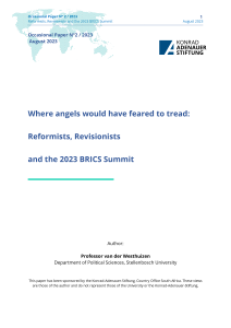 This paper has been sponsored by the Konrad-Adenauer-Stiftung, Country Office South Africa. These views are those of the author and do not represent those of the University or the Konrad-Adenauer-Stiftung. A shortened version of this paper was published by the Business Day on 29 August 2023, available at: https://www.businesslive.co.za/bd/opinion/2023-08-29-janis-van-der-westhuizen-reformists-revisionists-and-the-future-of-brics/