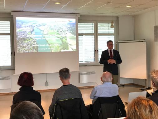 Energiewende - was ist das? Diese Frage erscheint mehr als berechtigt, ist sie doch in aller Munde und tägliches Thema der Nachrichten. Das Regionalbüro Südbaden versuchte, sich dieser bedeutenden Frage bei einer Exkursion ans Wasserkraftwerk nach Wyhlen am Hochrhein bei Basel anzunähern. Am Donnerstag, 30. März besichtigten 15 Interessierte das Kraftwerk samt der dortigen Power-to-Gas-Anlage zur Herstellung von Grünem Wasserstoff. Anschließend erfuhren sie bei einem "Praxisbericht" von Grenzach-Wyhlens Bürgermeister Dr. Tobias Benz die zahlreichen Chancen beim Umstieg auf regenerative Energie, denen - teils abstruse - gesetzliche Bestimmungen entgegenstehen.
