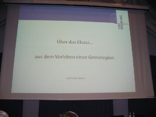 War das Elsass eigentlich schon immer eine Grenzregion mit dem Rhein als Begrenzungslinie? Auf diese Frage ging Prof. Dr. Dieter Speck, Lehrbeauftragter an der Universität Freiburg, in seinem Vortrag vor knapp 80 interessierten Gästen in Bad Krozingen ein. Um diese Frage zu beantworten, zeigte der Historiker zunächst von der römischen Antike ausgehend, die geschichtliche Entwicklung der Region auf. Das Gebiet des Elsass sei lange Zeit nicht genau eingegrenzt gewesen. Zum einen hätten die Menschen damals festgelegte Grenzen in der heutigen Form nicht gekannt, zudem wäre eine Grenzfestlegung kaum möglich gewesen, da der Rhein zur damaligen Zeit häufig seinen Verlauf änderte und somit nicht als Grenzlinie hätte dienen können. An Hand von historischen Karten erläuterte Professor Speck anschließend, dass das Gebiet zunächst von den Römern erobert wurde, dann Teil des Ostfränkischen Reiches wurde und später unter habsburgischer Herrschaft stand. Am Ende des 30-jährigen Kriegs wurde das Elsass dann vom französischen König annektiert. Es gehörte zollrechtlich aber weiterhin zum Reich und stellte somit eine Brücke zwischen den habsburgischen und den französischen Gebieten dar. Aber auch kulturell, so machte der Historiker deutlich, sei das Elsass keine Grenzregion gewesen. In dem Gebiet habe man oft sowohl deutsch als auch französisch gesprochen. Auch gab es enge Verbindungen zwischen den Universitäten in Freiburg und Dole. Somit sei das Elsass bis in die Neuzeit hinein nicht als Grenz-, sondern als Durchgangsregion zu sehen.