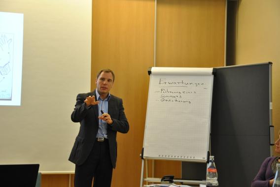 Der nächste Tag begann, nach einem ausgiebigen Frühstück, mit dem Vortrag von Annette Wilbert, der Koordinatorin der Stabsstelle Methodik und Didaktik in der Hauptabteilung Politische Bildung der KAS. Ihr Themenschwerpunkt war die konzeptionelle und organisatorische Durchführung und Nachbereitung von Veranstaltungen. Im Koreferat mit Herrn Wolf wurde auch der Umgang mit schwierigen Situationen vermittelt und durch Beteiligung der erfahrenen Tagungsleiter konnten die Seminarteilnehmer direkt von einem Erfahrungsschatz aus mehreren Jahrzehnten profitieren. Der breite Konsens: Jeder muss sich der Rolle des Tagungsleiters auf seine Weise annähern und sich dabei authentisch und wohl fühlen. Ein Patentrezept gibt es nicht.
