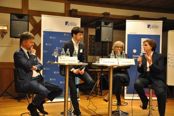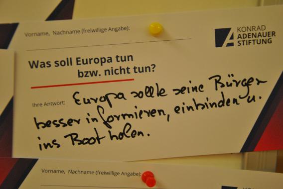 „Sie sind gefragt!“ war am Mittwochabend, 13. März in der Winzergenossenschaft in Offenburg-Weierbach die Devise, als das Regionalbüro Südbaden der Konrad-Adenauer-Stiftung zum Europadialog lud. Sie, das waren rund 60 Gäste, die ihre Meinungen zu Europa betreffenden Themenfeldern auf Karten schreiben konnten, die am Ende aller bundesweit stattfindenden Veranstaltungen in Berlin gesammelt und ausgewertet werden. „Was soll Europa tun/nicht tun?", „die drängendsten Herausforderungen für Europa" und „wie erleben Sie Europa im Alltag?" bildeten die drei Themenschwerpunkte, zu denen die Meinung der Bürger gefragt war. Fundierte Redebeiträge aus dem Publikum waren dann die Grundlage, anhand derer Frederick Aly diesen konstruktiven und in sachlicher Atmosphäre verlaufenden Abend moderierte. Das Podium war vielfältig und ermöglichte Antworten aus unterschiedlichen Perspektiven auf die Anliegen der Bürger: Neben dem EVP-Abgeordneten Andreas Schwab waren die Offenburger Bürgermeisterin a.D. Edith Schreiner und die Vizepräsidentin der IHK südlicher Oberrhein, Brigitta Schrempp, vertreten.