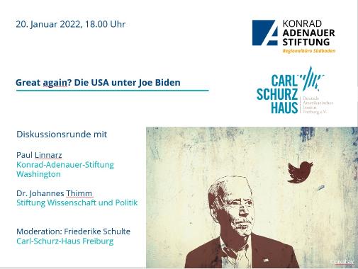 Die Wahl Joe Bidens hatte zumindest bei vielen westlichen Beobachtern Hoffnung ausgelöst: Nach vier Jahren Donald Trump versprach der 46. Präsident der Vereinigten Staaten, dass sich wieder eine gewisse Normalität einstellen könnte. Doch schon der Sturm auf das Kapitol am 6. Januar 2021 zeigte, dass die Hoffnung trügerisch war. Die USA sind noch immer zerrissen. Tiefe Gräben ziehen sich durch Gesellschaft und Politik und sorgen dafür, dass zunehmend zwei unterschiedliche Realitäten nebeneinander existieren. Auch außenpolitisch könnte es besser laufen: Bidens Amtszeit wird mit dem desaströsen Abzug aus Afghanistan verbunden bleiben und in Osteuropa muss sich zeigen, ob die USA noch als Ordnungsmacht und als Stütze der NATO auftreten können und wollen. Joe Biden ist mit großen Plänen und auch mit großen Versprechen angetreten. Das Regionalbüro Südbaden der Konrad-Adenauer-Stiftung zog mit Paul Linnarz, Leiter des Auslandsbüros der Stiftung in Washington D. C., und Dr. Johannes Thimm, Stiftung Wissenschaft und Politik, eine Bilanz nach einem Jahr Joe Biden. Unterstützt vom Carl-Schurz-Haus Freiburg sprachen wir am Jahrestag seiner Amtseinführung darüber, was seine Administration umsetzen konnte, vor welchen Herausforderungen die USA stehen und was sich im vergangenen Jahr geändert hat, wobei über 100 Teilnehmer der Diskussion folgten.