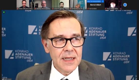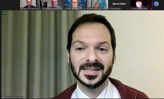 Dr. Johannes Thimm hob anschließend mit Blick auf die US-Außenpolitik hervor, dass der grundsätzliche Glaube an Zusammenarbeit mit anderen demokratischen Staaten wieder das bestimmende Credo der Vereinigten Staaten ist. Im Gegensatz zu Donald Trump unterscheidet die Biden Administration wieder deutlich zwischen Demokratien und autokratischen Staaten, was in Zeiten sinkender demokratischer Teilhabe ein wichtiges Zeichen ist. Jedoch sieht er die vielbeschworene Konsultation mit den europäischen Verbündeten kritisch, denn in Afghanistan oder der Ukraine-Krise sahen sich die europäischen Partner kaum eingebunden.