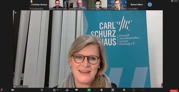 Die angespannte Situation an der Grenze zwischen der Ukraine und Russland eröffnete die von Friederike Schulte, Direktorin des Carl-Schurz-Hauses, moderierte Gesprächsrunde. Linnarz wies darauf hin, dass die Situation in Osteuropa keinesfalls neu ist und die Mehrheit in Washington einen Einmarsch Russlands für realistisch hält. Biden kämpft nun vor allem mit Vorwürfen, er agiere zu halbherzig. Thimm ergänzte, dass am Ende keiner dazu bereit wäre, einen Krieg für die Ukraine zu führen; das wisse auch Joe Biden. Entsprechend schwierig gestaltet sich die Verhandlungsbasis: Putin hat nicht nur mehr Truppen vor Ort, sondern wird auch von der Überzeugung getragen, die Ukraine gehöre zu Russland und die NATO habe mit der Osterweiterung ein Versprechen gebrochen. Eine Entspannung oder ein Rückzieher Russlands sind im Augenblick eher nicht in Sicht.
