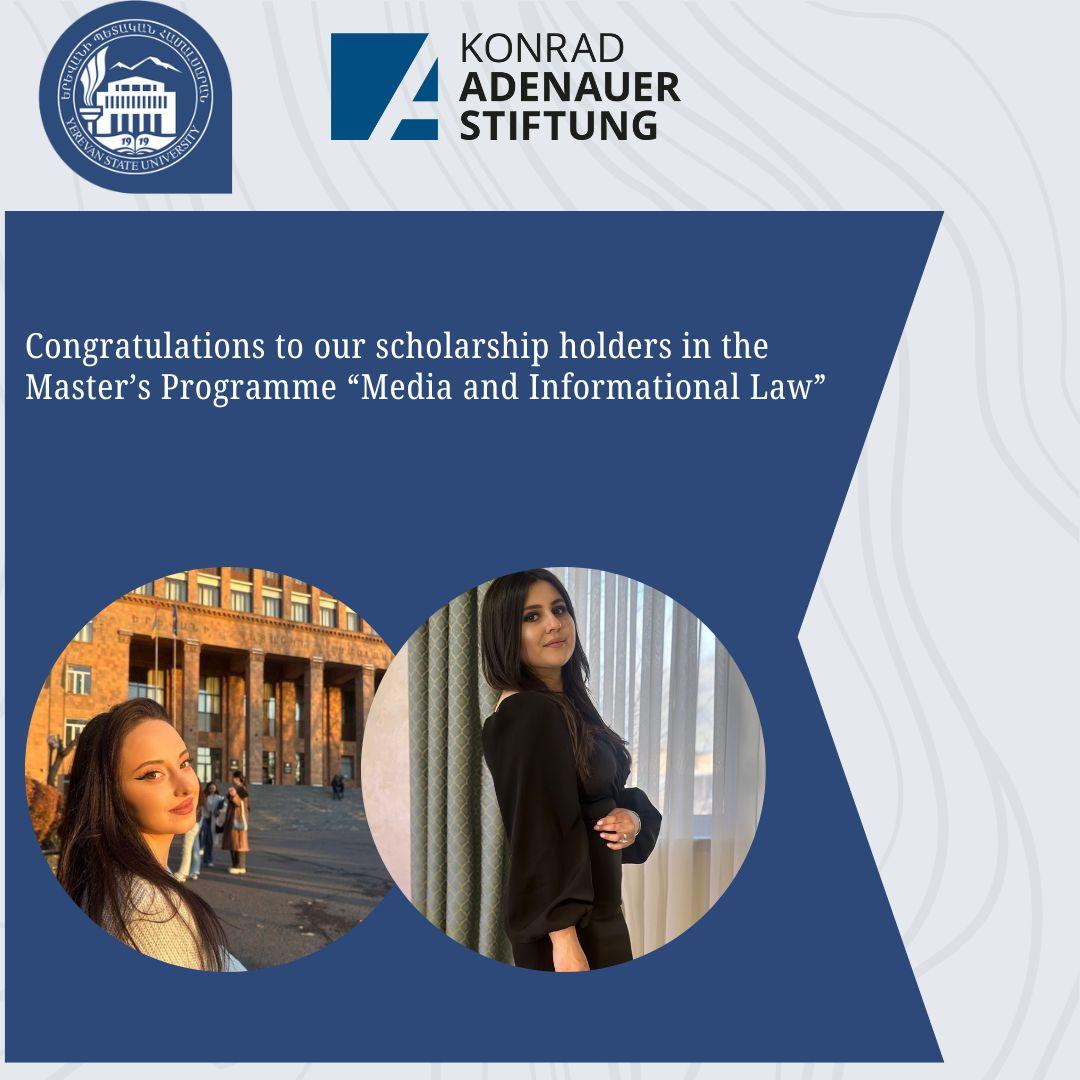 Wir freuen uns, bekannt geben zu können, dass zwei Studierende des Masterstudiengangs "Medien- und Informationsrecht" an der Juristischen Fakultät der Staatlichen Universität Jerewan Stipendien der Konrad-Adenauer-Stiftung erhalten werden.