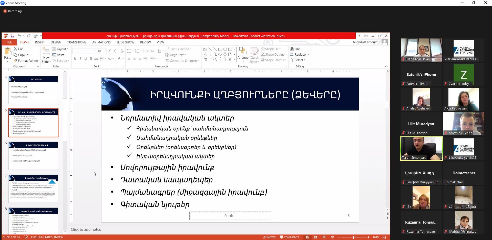 Matthias Hespe (stellvertretender Leiter des Regionalprogramms "Politischer Dialog Südkaukasus" der Konrad-Adenauer-Stiftung) und Lilit Mirzoyan (stellvertretende Leiterin des Zentrums für Europäische Studien der Staatlichen Universität Jerewan) eröffneten das Seminar mit Begrüßungsworten. In den folgenden Tagen erhielten die Teilnehmer Schulungen von Narek Galstyan (Dozent am Lehrstuhl für Politikwissenschaft an der Fakultät für internationale Beziehungen, Staatliche Universität Jerewan), Taron Simonyan (Kandidat der Rechtswissenschaften, Lektor am Lehrstuhl für Geschichte und Theorie des Staates und des Rechts, juristische Fakultät, Staatliche Universität Jerewan) und Prof. Dr. Ashot Aleksanyan (Leiter des Lehrstuhls für Politikwissenschaft an der Fakultät für internationale Beziehungen, Staatliche Universität Jerewan, Gastwissenschaftler am Institut für Politikwissenschaft der Friedrich-Schiller-Universität Jena, Deutschland). Die Gruppenarbeiten wurden von Gayane Vardanyan (Methodikerin, Mitglied der Expertengruppe) koordiniert, die die Struktur des methodischen Handbuchs vorstellte. Das Fortbildungsprogramm ist auf den methodischen und pädagogischen Handbüchern für das Fach Gesellschaftskunde basiert, die im Rahmen der Zusammenarbeit zwischen der Konrad-Adenauer-Stiftung, dem Ministerium für Bildung, Wissenschaft, Kultur und Sport der Republik Armenien und dem Zentrum für Europäische Studien der Staatlichen Universität Jerewan veröffentlicht wurden.