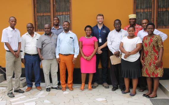 Treffen mit ausgewählten, innerhalb des Projektes "United for our rights" geschulten Trainerinnen und Trainern zur Korruptionsbekämpfung in der Region Pwani mit John Villiers (EU-Delegation Tansania (Mitte)) sowie Vertretern des Projektteams (Projektmanagerin Maria Kayombo (Mitte) und Trainingskoordinator Damas Nderumaki (3. v. links))