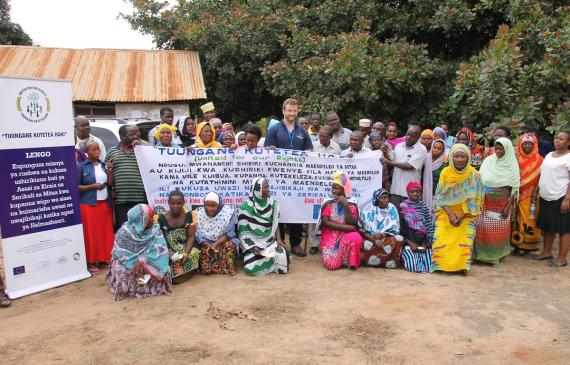 Gruppenfoto mit den Teilnehmerinnen und Teilnehmern einer Trainingseinheit in der Gemeinde Mbwawa (Region Pwani)und Herrn John Villiers (Vertreter der EU-Delegation Tansania), Frau Maria Kayombo (KAS-Projektmanagerin) und Herrn Damas Nderumaki (KAS-Trainingskoordinator für die Region Pwani)