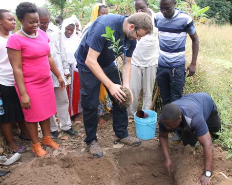 Gemeinsam mit Maria Kayombo (Projektmanagerin) und einem Vertreter der zivilgesellschaftlichen Organisation 'Pwani Development Promotion Agency' (Pwani DPA) pflanzt John Villiers (EU-Delegation Tansania) den sog. 'tree of transparency' in der Gemeinde Mbwawa als Zeichen der Korruptionsbekämpfung und Transparenzförderung.