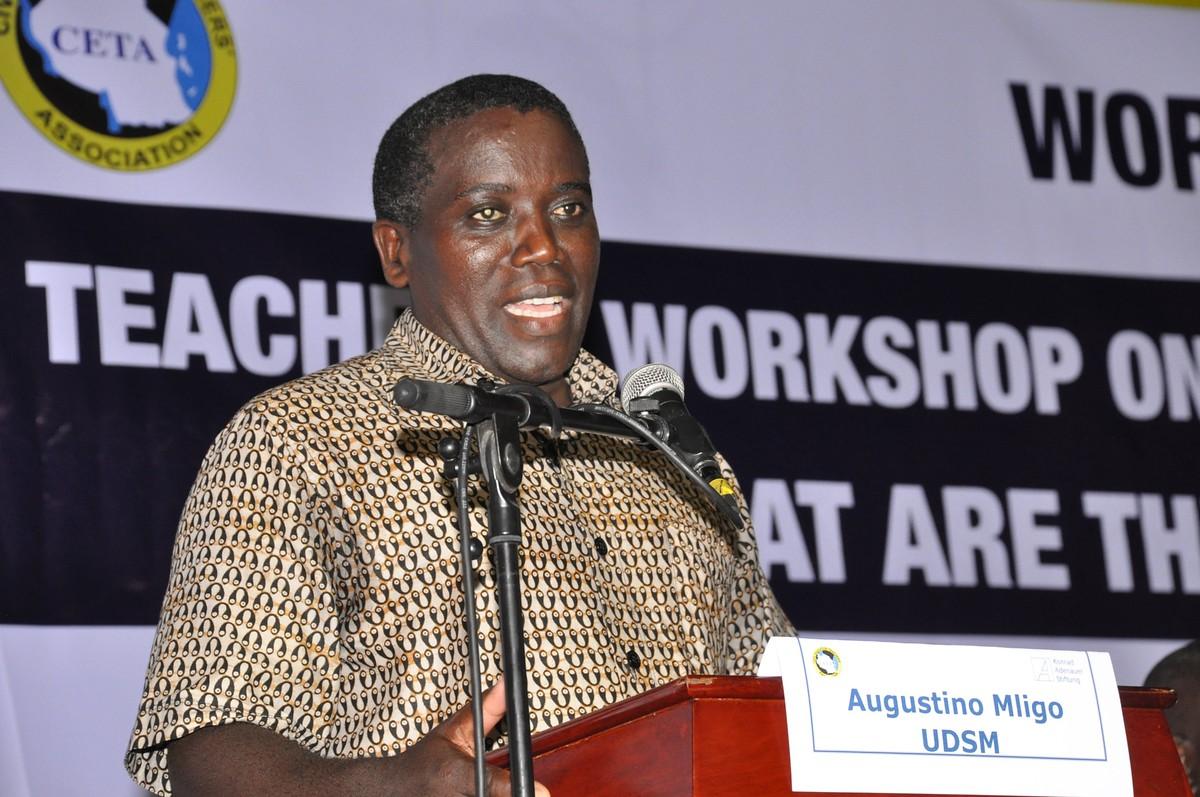 Moderator Augustino Mligo heißt die Teilnehmer des Lehrer Workshops willkommen und fordert zu regen Teilnahme auf.