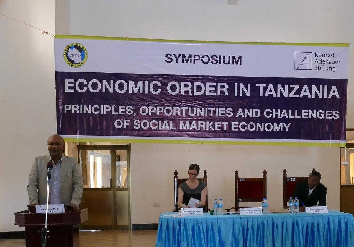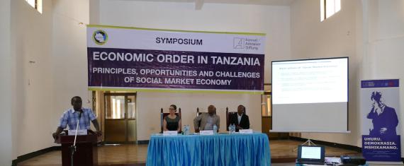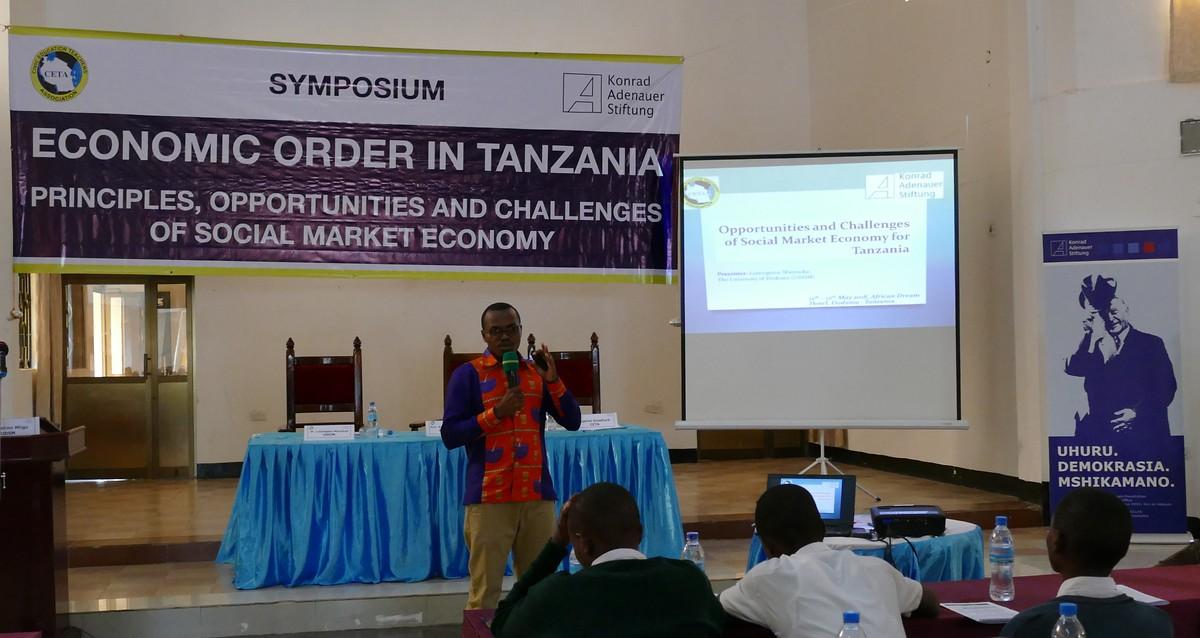 Dr. Lutengano (Universität Dodoma) informiert über die Möglichkeiten und Herausforderungen der sozialen Marktwirtschaft für Tansania