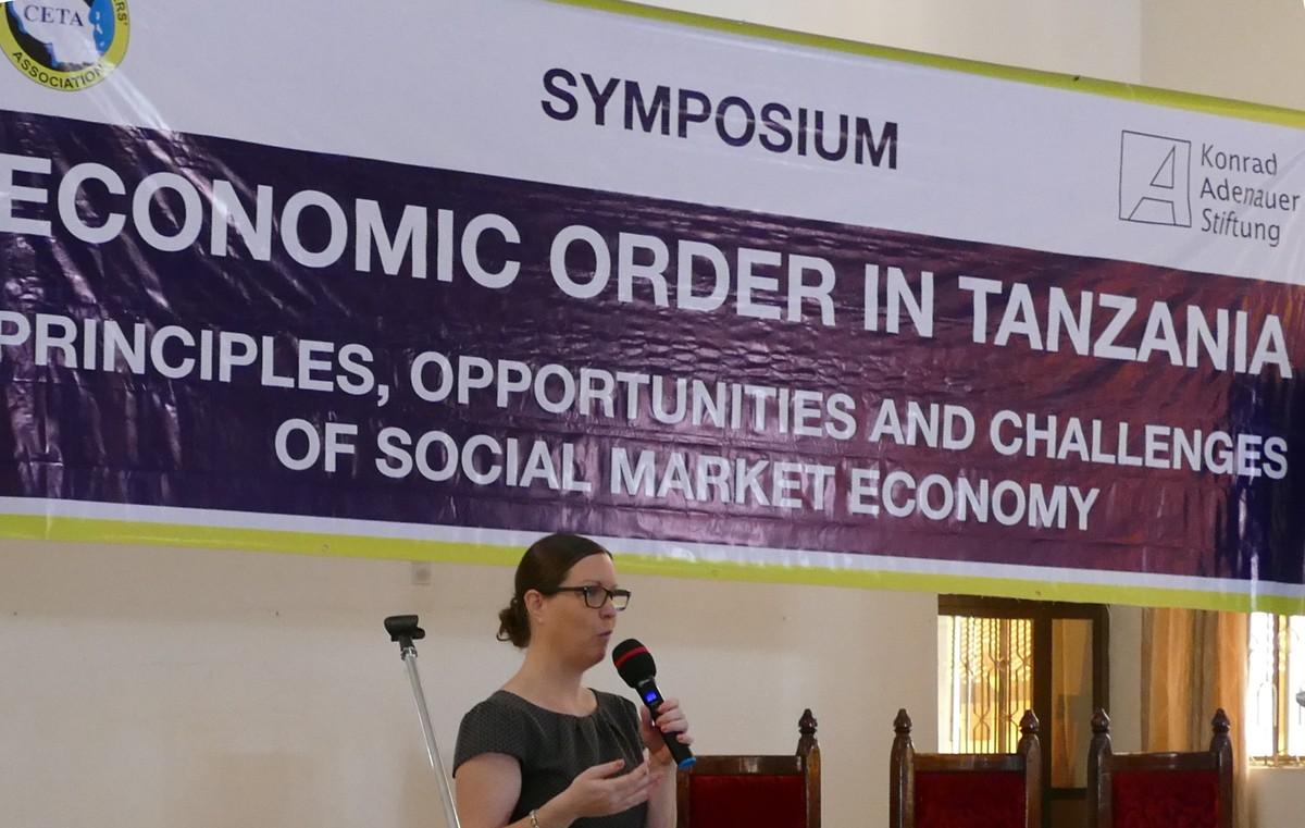 Dr. Stefanie Brinkel (Projektmanangerin der KAS) referiert über die ökonomische Geschichte von Tansania und erklärt die Prinzipien der sozialen Marktwirtschaft