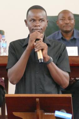 Der Moderator Augustino Mligo fasst die Ergebnisse der Diskussion zusammen.