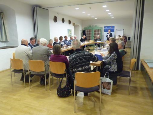 In einem einstündigen Vortrag beschrieb am Abend der Beauftragte der Thüringer Landesregierung zur Vorbereitung des Reformationsjubiläums, Dr. Seidel, Luthers reformatorische Bibelauslegung, die uns auch heute noch betrifft. Er lenkte den Blick hierbei auf die zwei großen Kirchen in Deutschland und formulierte mögliche ökumenische Perspektiven, die sich aus Luthers theologischen Ansichten ergeben können. Des Weiteren stellte Seidel Luthers Haltung gegenüber einigen wichtigen Prinzipien der katholischen Kirche in acht wichtigen Punkten dar. Hierunter fällt beispielsweise die Tatsache, dass Luther nie gegen den Marienglauben war, er veröffentlichte gar eine Schrift über die heilige Maria und widmete sie seiner Mutter. Des Weiteren war Martin Luther, was die Institution der Klöster anging, nur gegen die unfreie Aufbewahrung von Menschen in ihnen. Die Auflösung ganzer Klöster in evangelischen Fürstentümern ging auf die Befehle einzelner Landesherren zurück und nicht auf Luther selbst.