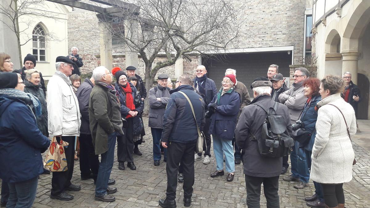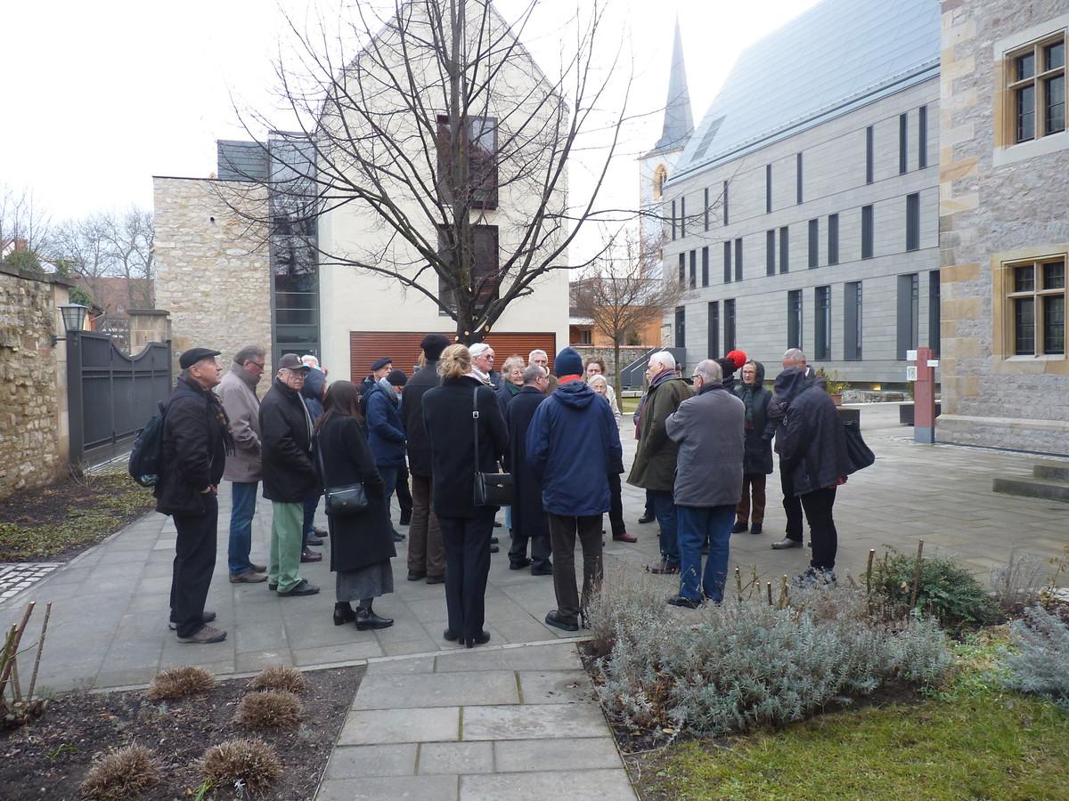 Das ehemalige Kloster der Augustiner-Eremiten beherbergte Martin Luther von 1505 bis 1512 und ist heute vor allem eine Tagungs- und Begegnungsstätte. Auf einem Rundgang durch das Kloster, die Augustinerkirche und die historische Bibliothek veranschaulichte Dr. Ludscheidt das alltägliche Leben der Augustiner-Eremiten und referierte außerdem zu der bewegten Geschichte des Klosters. Nach der Reformation ging die Einrichtung 1525 in den Besitz der evangelischen Kirche über. 1559 säkularisierte die Stadt Erfurt das Kloster. Ein Luftangriff in den Wirren des Zweiten Weltkriegs zerstörte große Teile des Klosters. In den Jahren zwischen 1979 und 1990 wurde das Kloster umfassend wiederhergestellt und ist heute ein anerkanntes Kulturdenkmal. Besonders beeindruckt zeigten sich die Teilnehmer von der historischen Bibliothek, welche 1646 als Stiftung einiger evangelischer Pfarrer gegründet wurde. Mit dem aktuellen Bestand von ca. 60.000 Bänden befindet sich hier eine der bedeutendsten Sammlungen an Büchern in Deutschland.