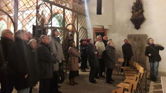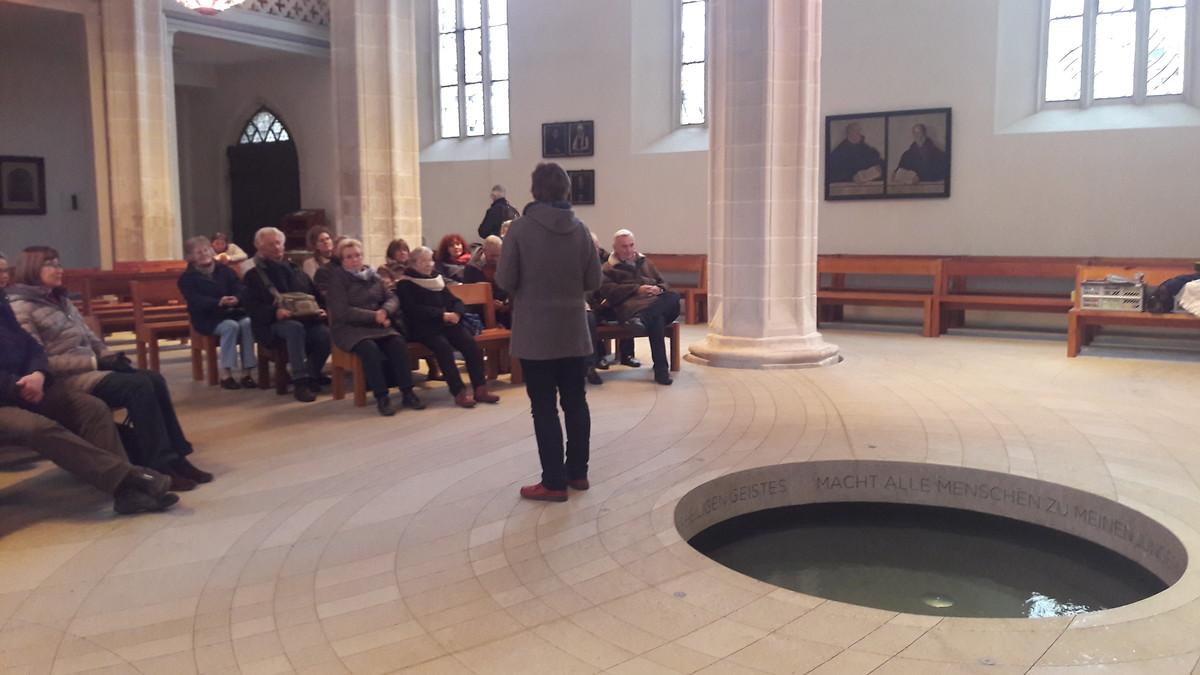 In der Taufkirche St. Petri und Paul wurde Martin Luther am 11. November 1483 getauft und somit ist die Kirche auch heute für viele noch von besonderer Bedeutung. Die Pfarrerin Carstens-Kant erzählte den Anwesenden etwas zu der Geschichte der Kirche und zu der heutigen Nutzung. Ende April 2012 wurde die Kirche als „Zentrum Taufe“ wiedereröffnet. Der spätgotische Kirchenraum wurde verändert und eine neue Botschaft soll von der Kirche ausgehen: Um ihrem Namen gerecht zu werden, legt die Kirche heute einen Akzent auf den Akt der Taufe in unserer Zeit. Dazu fällt ein in den Boden eingelassenes, großes rundes Taufbecken in der Mitte der Kirche besonders ins Auge, das – dank modernster Einrichtungen eine Ganzkörpertaufe auch in den Wintermonaten ermöglicht. Im Anschluss an die Worte der Pfarrerin und einige Fragen der Teilnehmer blieb außerdem noch die Zeit, den restaurierten Taufstein Martin Luthers zu betrachten und den Kircheninnenraum mit seinen historischen Fenstern und vielen Botschaften, die im Wesentlichen durch neues Design altbekannter Strukturen vermittelt werden, zu bewundern.