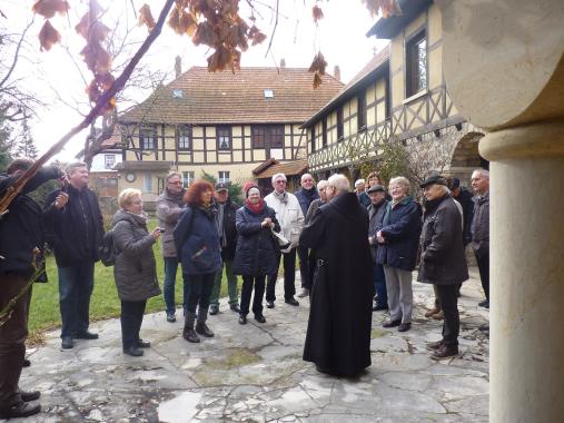 Nachdem die Gruppe einen kurzen Halt bei dem Lutherstein gemacht hatte, welcher dem Gelübde Martin Luthers gedenkt, fuhr sie zu ihrem letzten Ziel des Wochenendes. Angekommen am Priorat St. Wigberti begrüßte Pater Franz die Teilnehmer und führte durch das Koster und die Klosterkirche. Mittels einiger Anekdoten erzählte er von dem alltäglichen Klosterleben und ging auch auf die bewegte Vergangenheit des Konvents ein. In dem Kloster St. Wigberti sowie zuvor in dem Augustinerkloster zu Erfurt war die Möglichkeit zur Andacht gegeben, die von Herrn Dr.Christoph Treutwein - als Tagungsteilnehmer - wundervoll musikalisch mit seinem Telemannkonzert auf der Oboe umrahmt wurden.