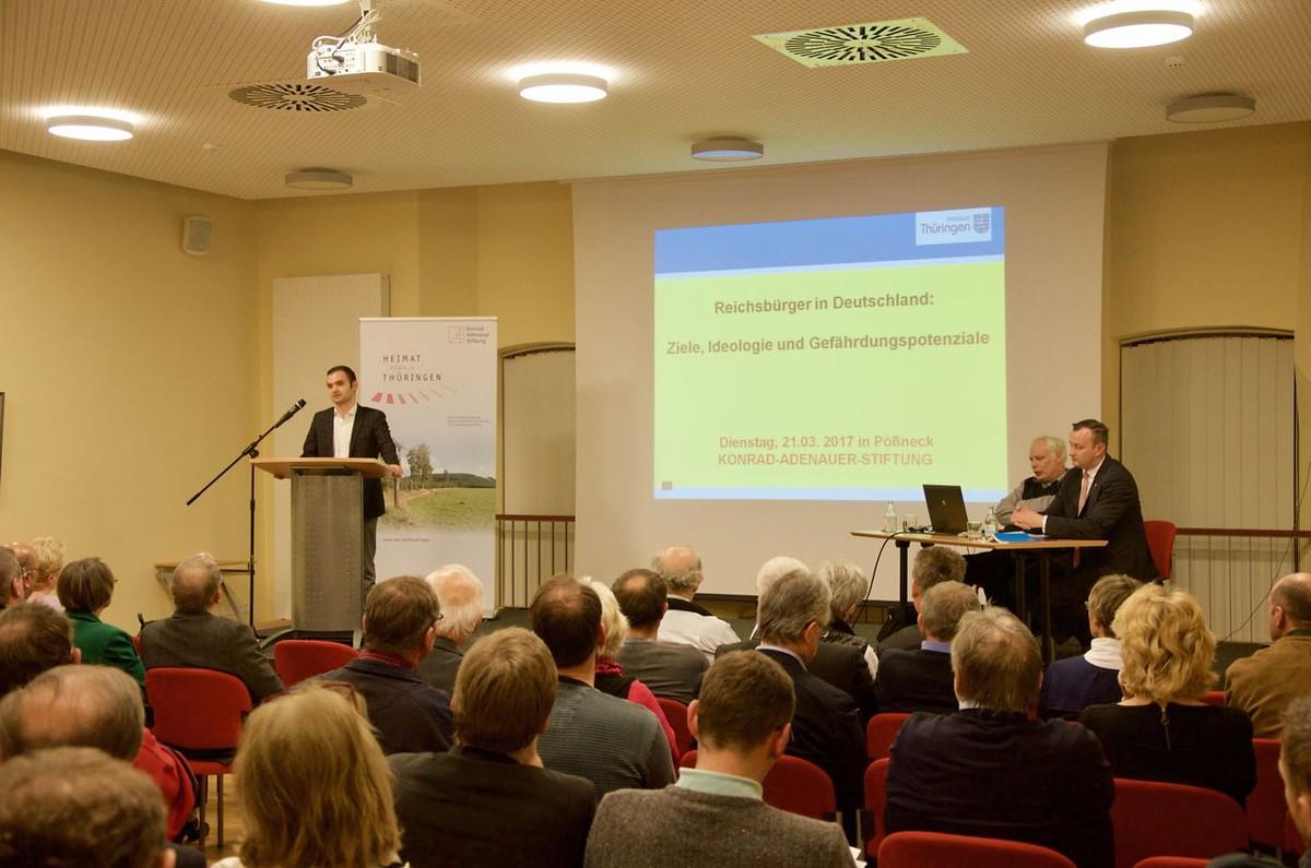 Am 21.03.2017 führte das Politische Bildungsforum Thüringen der Konrad-Adenauer-Stiftung in der Pößnecker Stadtbibliothek eine Vortragsveranstaltung mit anschließender Diskussion zum Thema „Reichsbürger in Deutschland“ durch. 95 Bürger nahmen an der Veranstaltung teil. Die Veranstaltung dauerte etwa zwei Stunden, wobei der Vortrag und die Diskussion jeweils 60 Minuten umfassten.