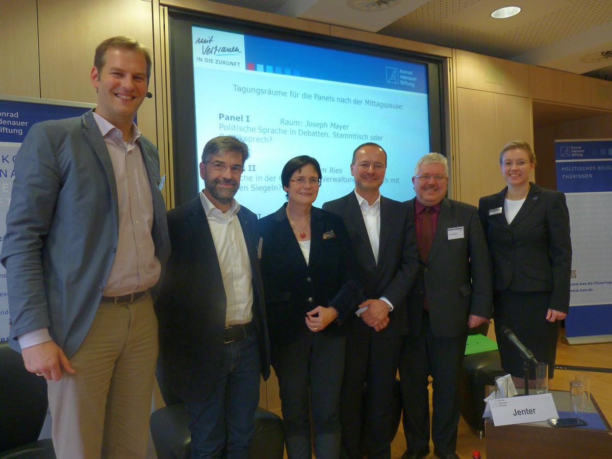 Im Panel I diskutierten mit Karsten Jauch von der Thüringer Allgemeinen, Matthias Gehler, MDR-Hörfunkchef und Tobias Bott, Pressesprecher der Konrad-Adenauer-Stiftung 3 Journalisten aus verschiedenen Medienbereichen. Karsten Jauch bestätigte durchaus die Existenz einer genuinen politischen Sprache und Begriffe, die einerseits wie „Flüchtlingskrise“ oder „Obergrenze“ sehr selbstreferentiell ist und andererseits Statements und Sprache von Politikern mit vielen Worten ohne erkennbaren Inhalt, deren Sprachduktus aber klar dem politischen Bereich zuzuordnen ist. Als Printjournalist sei seine Aufgabe oft die „Übersetzung“, aber natürlich müsse er in Thüringens größter Zeitung auch die Sprache der großen politischen Diskurse bedienen, wobei er dennoch versuche, dies für die Leser gut verständlich darzustellen.