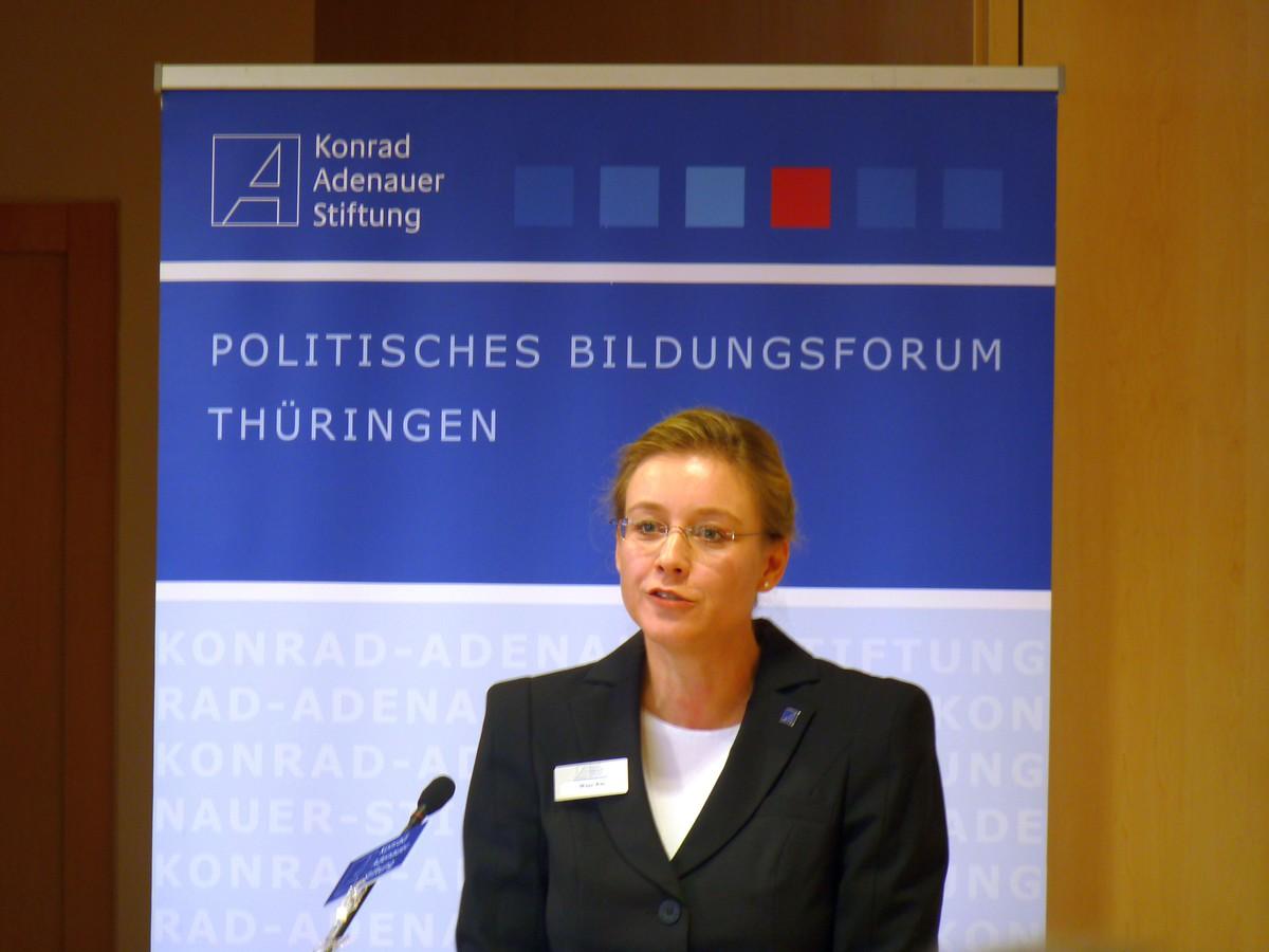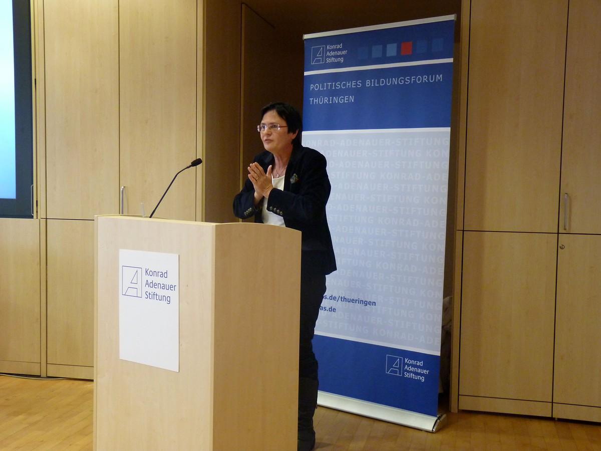Christine Lieberknecht, seit 1991 Abgeordnete im Thüringer Landtag und von 2009 bis 2014 Ministerpräsidentin des Freistaates Thüringen, die in Vertretung für Christian Carius MdL erschien, machte den Anfang. Die ausgebildete Theologin sprach über die Bedeutung der Sprache für sie, erzählte aus ihren persönlichen Erfahrungen, griff hierzu Fallbeispiele aus ihrer eigenen politischen Karriere auf und thematisierte die Debattenhoheit durch die Bedeutungshoheit von Begriffen.