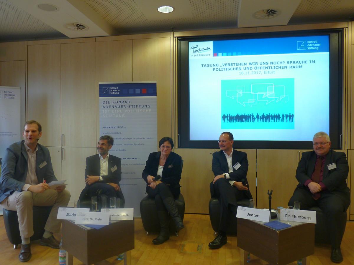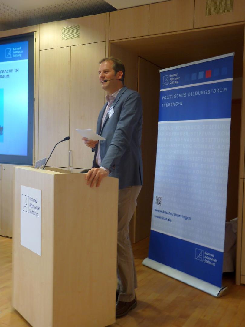 Unter dem Titel „Verstehen wir uns noch? Sprache im Politischen und Öffentlichen Raum“ lud das Bildungsforum der Konrad-Adenauer-Stiftung Thüringen am 16.11.2017 zu einer Tagung zum Thema politische Sprache in die Messe Erfurt. 47 Teilnehmer verschiedener Altersgruppen nahmen an der Veranstaltung teil.
