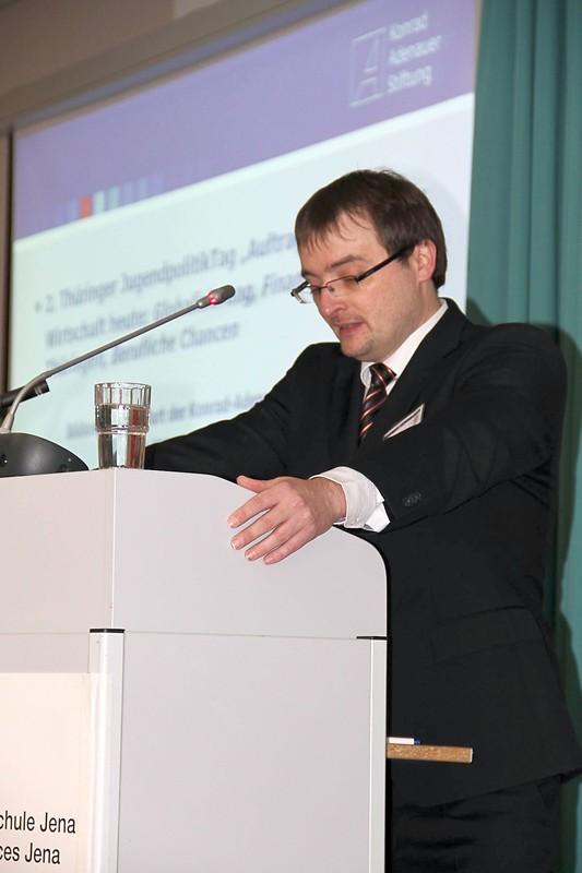 Der zweite Thüringer Jugendpolitiktag am 24. November führte Referenten, Moderatoren, Unternehmen sowie Lehrer und Schüler aus Jena, Apolda und Zeulenroda direkt in die Aula der Fachhochschule Jena. Dort eröffnete der wissenschaftliche Mitarbeiter der Konrad-Adenauer-Stiftung Daniel Braun den 2. Thüringer Jugendpolitiktag „Auftrag Demokratie“ unter Schirmherrschaft von Christine Lieberknecht zum Thema Wirtschaft heute: Globalisierung, Finanzen, Freistaat Thüringen, Berufliche Chancen.