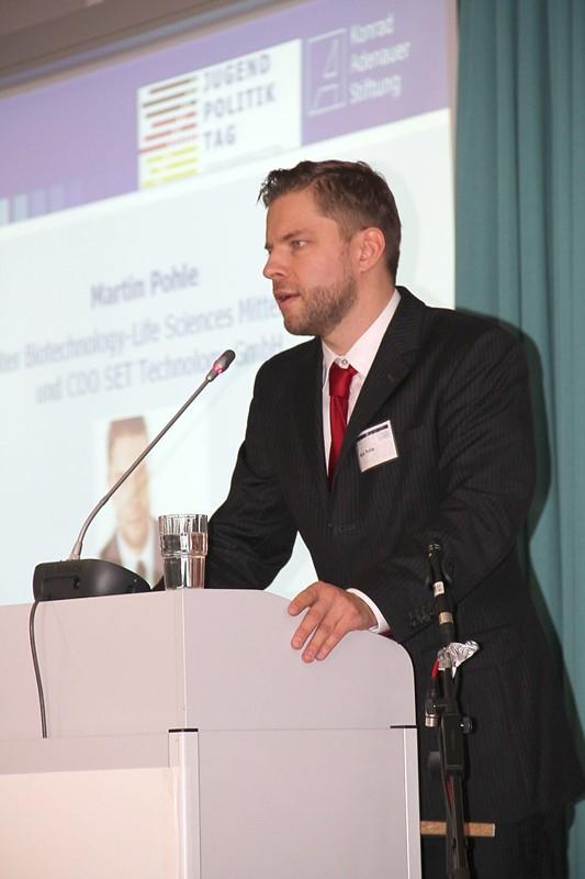 Ein positives Bild zeichnete auch der Projektleiter Biotechnologie-Life Sciences Mitteldeutschland und COO SET Technology GmbH Martin Pohle. Seit etwa zwei Jahren als Gründer einer inzwischen 20köpfigen Beratungsgesellschaft unterwegs, machte der Jungunternehmer den jungen Zuhörern Mut auf Neues. Virtuelle Netzwerke bestimmen den modernen Arbeitsalltag des ehemaligen Fachhochschülers aus Jena. Gleich zu Beginn der Ausführungen ging Pohle auf die aktuelle Weltwirtschaftskrise, Rettungsschirme und gelebte Politik ein. In seinen Beobachtungen registrierte der Unternehmer eine wachsende Unzufriedenheit der jungen Leute, die nicht mehr zu „abstrakten“ Themen demonstrieren, sondern ganz konkrete Fragen an die Politik und Wirtschaft stellen und Teilhabe und Mitbestimmung einforderten. Solch ein Jugendpolitiktag sei dabei eine gute Möglichkeit, ein erstes Bewusstsein bei jungen Leuten zu schaffen, um sich in die Politik aktiv einzubringen. Denn „aus Verdruss wird Fanatismus“ wusste Pohl und verurteilte den „Braunen Abgrund“, der leider tagesaktuell auch in Thüringen für Schlagzeilen sorgt.