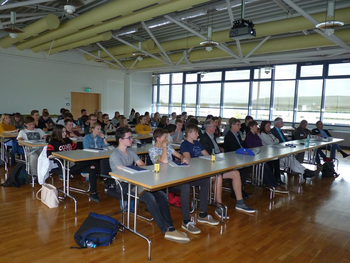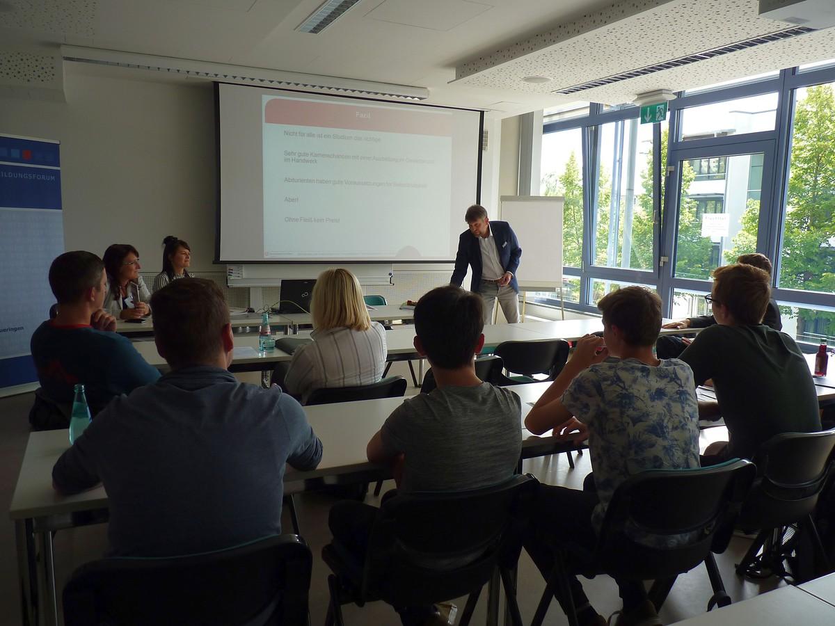 Nach einer kurzen Begrüßung durch Daniel Braun, wissenschaftlicher Mitarbeiter des Bildungsforums, über-nahm der Hauptgeschäftsführer der IHK Ostthüringen zu Gera, Peter Höhne das Wort. In seiner Anrede sprach er über seinen beruflichen Weg und betonte stets die Wichtigkeit der eigenen Horizonterweiterung, beispielsweise durch Auslandsaufenthalte. Er riet zu Mut und zur Risikobereitschaft. Dabei sprach er aus seinen eigenen Erfahrungen und hob hervor, dass unabhängig davon, ob man sich für eine Ausbildung oder ein Studium entscheidet, die Grundlage allen eine gute Ausbildung ist, welche entscheidend für den weiteren Lebensweg ist. Als Vorteile der Berufsausbildung erwähnte er die dreijährige Berufserfahrung, die finanzielle Unabhängigkeit und den Einblick in wirtschaftliche Vorgänge.