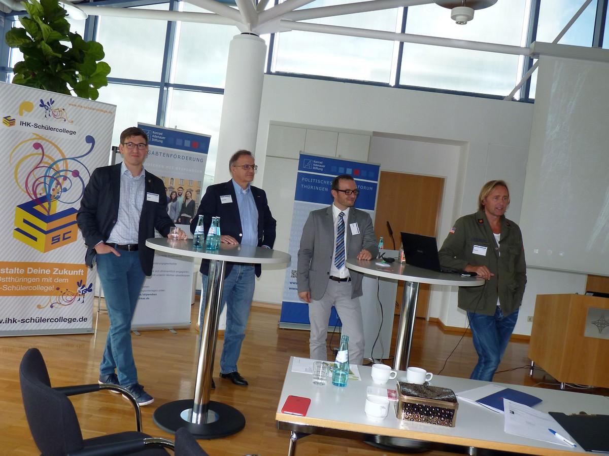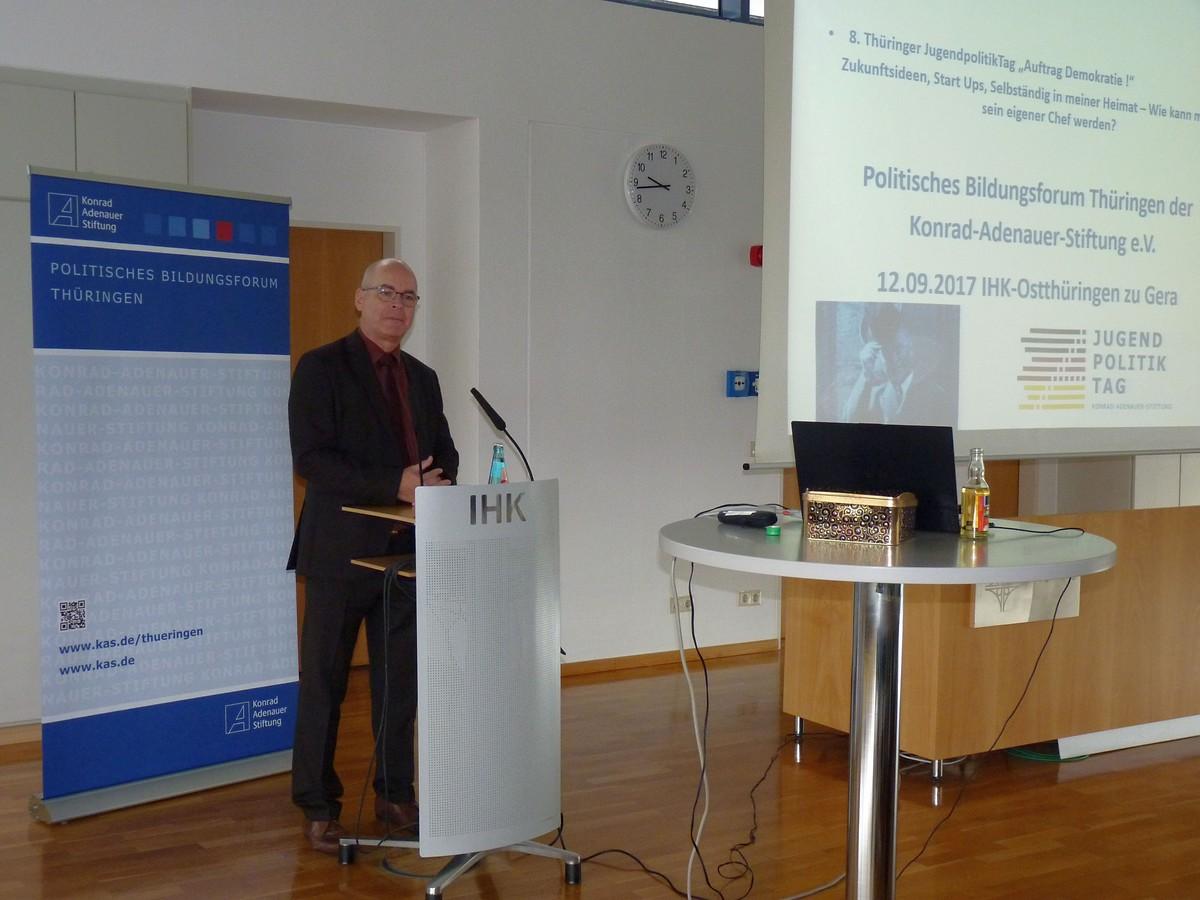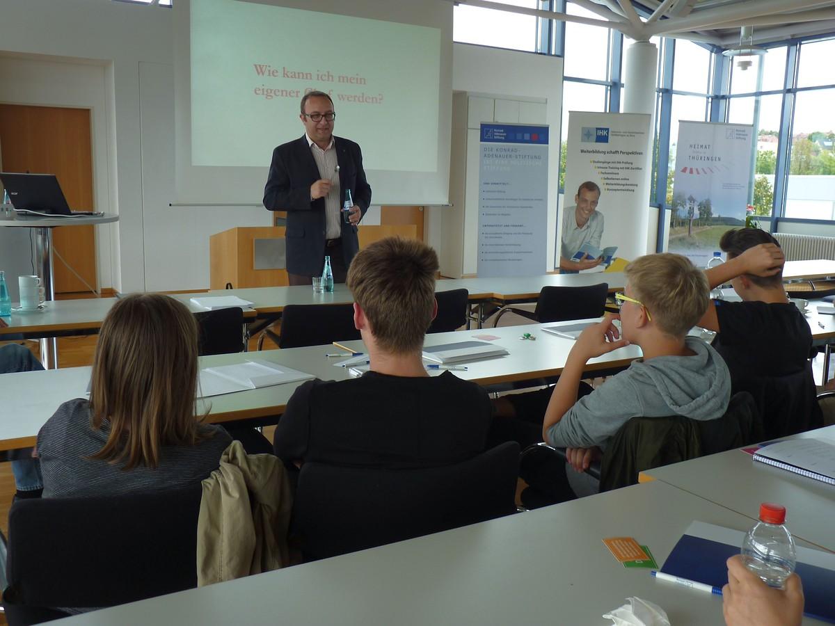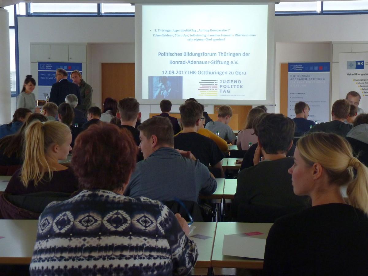 Am 12. September fand in Anwesenheit von 45 Schülern der vom Bildungsforum der Konrad-Adenauer-Stiftung Thüringen organisierte 8. JugendpolitikTag, statt. Unter der Überschrift „Zukunftsideen, Start-Ups, Selbständig in meiner Heimat – Wie kann man sein eigener Chef werden?“ wurde im IHK Bildungszentrum Gera über das ökonomische Potenzial sowie die beruflichen Chancen und Möglichkeiten innerhalb Thürin-gens diskutiert.